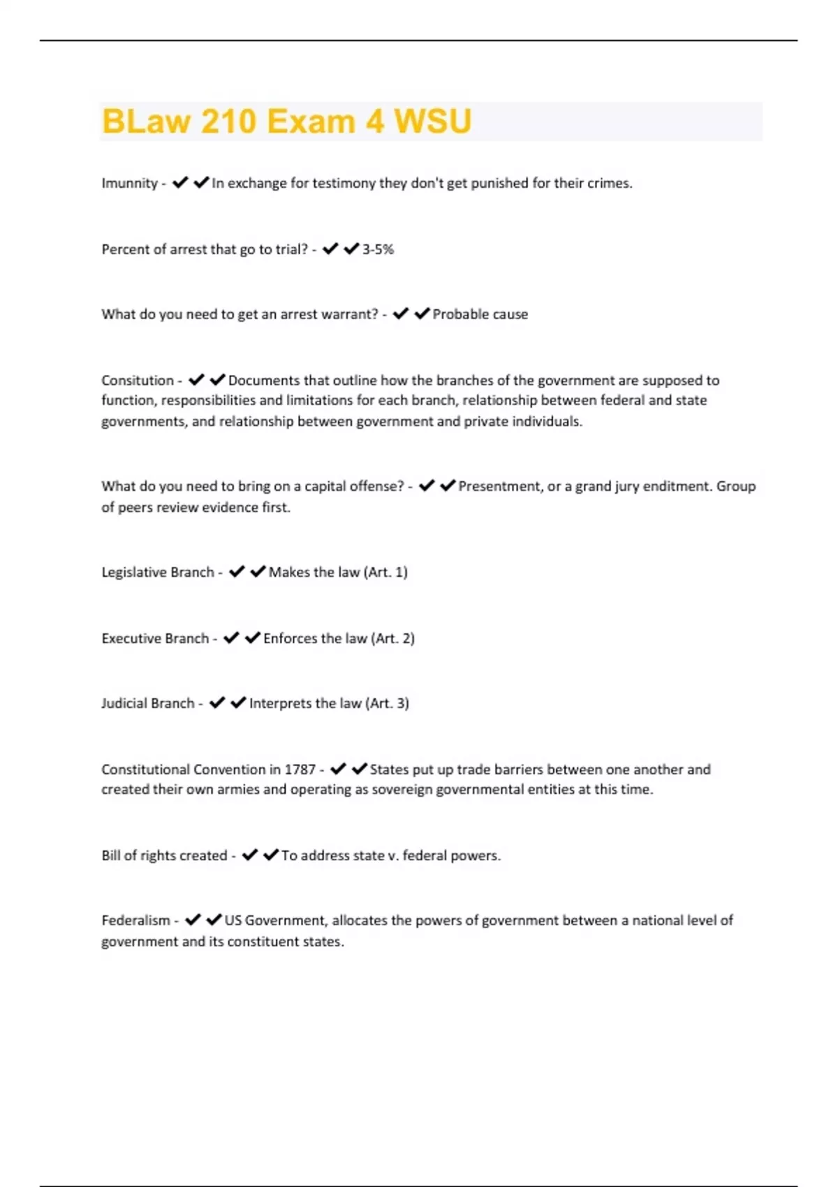 Imunnity - In exchange for testimony they don't get punished for their crimes. Percent of arrest that go to trial? - 3-5% What do you need to get an arrest warrant? - Probable cause Consitution - Documents that outline how the branches of the government are supposed to function, responsibilities and limitations for each branch, relationship between federal and state governments, and relationship between government and private individuals. What do you need to bring on a capital offense? - Presentment, or a grand jury enditment. Group of peers review evidence first. Legislative Branch - Makes the law (Art. 1) Executive Branch - Enforces the law (Art. 2) Judicial Branch - Interprets the law (Art. 3) Constitutional Convention in 1787 - States put up trade barriers between one another and created their own armies and operating as sovereign governmental entities at this time. Bill of rights created - To address state v. federal powers. Federalism - US Government, allocates the powers of government between a national level of government and its constituent states.Shared powers are called - Concurrent powers Sovereignty - Ability to ruke The US is - a government of the people, by the people, for the people.