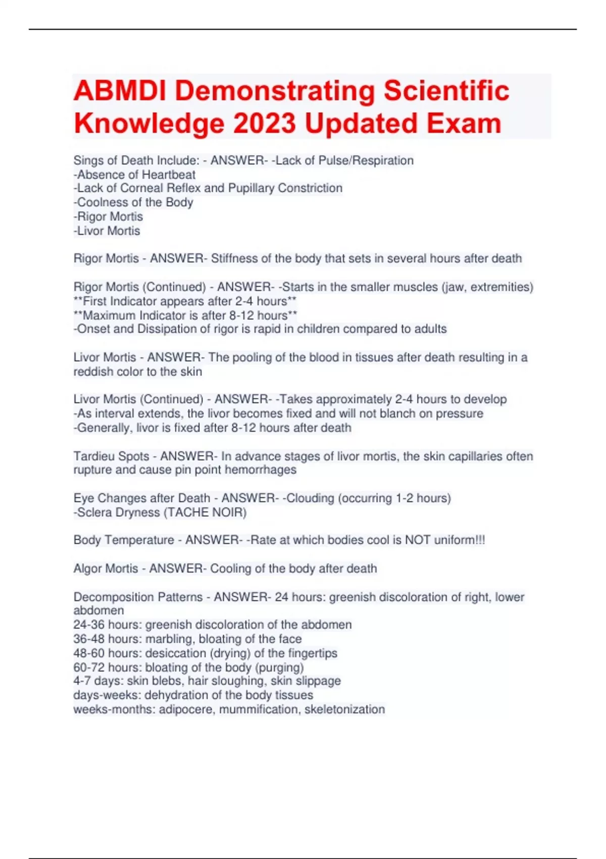 ABMDI Demonstrating Scientific Knowledge 2023 Updated Exam Sings of Death Include: - ANSWER- -Lack of Pulse/Respiration -Absence of Heartbeat -Lack of Corneal Reflex and Pupillary Constriction -Coolness of the Body -Rigor Mortis -Livor Mortis Rigor Mortis - ANSWER- Stiffness of the body that sets in several hours after death Rigor Mortis (Continued) - ANSWER- -Starts in the smaller muscles (jaw, extremities) **First Indicator appears after 2-4 hours** **Maximum Indicator is after 8-12 hours** -Onset and Dissipation of rigor is rapid in children compared to adults Livor Mortis - ANSWER- The pooling of the blood in tissues after death resulting in a reddish color to the skin Livor Mortis (Continued) - ANSWER- -Takes approximately 2-4 hours to develop -As interval extends, the livor becomes fixed and will not blanch on pressure -Generally, livor is fixed after 8-12 hours after death Tardieu Spots - ANSWER- In advance stages of livor mortis, the skin capillaries often rupture and cause pin point hemorrhages Eye Changes after Death - ANSWER- -Clouding (occurring 1-2 hours) -Sclera Dryness (TACHE NOIR) Body Temperature - ANSWER- -Rate at which bodies cool is NOT uniform!!! Algor Mortis - ANSWER- Cooling of the body after death Decomposition Patterns - ANSWER- 24 hours: greenish discoloration of right, lower abdomen 24-36 hours: greenish discoloration of the abdomen 36-48 hours: marbling, bloating of the face 48-60 hours: desiccation (drying) of the fingertips 60-72 hours: bloating of the body (purging) 4-7 days: skin blebs, hair sloughing, skin slippage days-weeks: dehydration of the body tissues weeks-months: adipocere, mummification, skeletonization Inspect the Body (External: Head) - ANSWER- -Examine the scalp for hidden trauma! -Lacerations may stick together; bullet wounds may be obscured -Inspect ears for hemorrhage/foreign bodies -Evaluate eyes for petechial hemorrhages, jaundice, or trauma -Oral cavity may reveal trauma, foreign bodies, or evidence of poor hygiene -Nasal Septum may be perforated due to chronic cocaine abuse Inspect the Body (External: Neck) - ANSWER- -Any identifiable trauma should be documented -DO NOT recover specimens from neck veins of homicide victims (it might create trauma) -View the posterior neck as well! -Examine the neck for evidence of enlarged lymph nodes, thyroid, and/or other masses -Palpate the neck with PASSIVE flexion and extension to reveal fractures Inspect the Body (External: Chest) - ANSWER- -Examine the dimensions of the chest, documenting the anterior-posterior size -An enlarged, barrel-shaped chest is a sign of chronic lung disease. -Palpate the breasts for any masses Inspect the Body (External: Abdomen) - ANSWER- -Palpate the abdomen to detect the presence of fluid or masses. -Excessive fluid may represent liver cirrhosis or failure. -Document recent and remote surgical incisions. -Trauma may not be readily apparent over the abdominal wall due to the elasticity of the tissues Inspect the Body (External: External Genitalia) - ANSWER- -Examine the external genitalia in the MALE for masses, ulcerations, and surgery. -Note the presence or absence of circumcision -IN FEMALE, examine for prolapse of the uterus, masses, trauma, and ulcerations Inspect the Body (External: Lower Extremities) - ANSWER- -Fractures of the hip are usually indicated by the shortening and external rotation of the limbs -Look for any trauma, fractures, burns, and scratches. -Ascertain the presence of edema or brownish discoloration, suggestive of congestive heart failure. Inspect the Body (External: Upper Extremities) - ANSWER- -Examine color and appearance of fingernails (torn or fractured fingernails may indicate a struggle. -DO NOT attempt to fingerprint the decedent until trace evidence has been recovered. -Examine the antecubital fossae of the arm for the presence of perforations or hemorrhage, which may indicate drug abuse. -Examine wrists for scarring, suggestive of past suicide attempts Inspect the Body (External: Back) - ANSWER- -Inspect the back for evidence of previous surgery or trauma Inspect the Body (External: Skin) - ANSWER- -Examine the skin for color, texture, inflammation, and injury. -Document any tattoos or other identifying marks -Yellow jaundice (icterus) is a sign of liver failure -Cherry red lividity indicates carbon monoxide or cyanide positioning (or an artifact of temperature) COMMON MISTAKES THAT INVESTIGATORS MAKE DURING BODY INSPECTION INCLUDE: - ANSWER- 1. Not removing all of the decedent's clothing when viewing the body, when permitted by office standard operating procedures 2. Missing Injuries and trauma that are hidden under bandages. 3. Missing trauma that is no readily evident in dark-skinned individuals 4. Just not looking for trauma or injuries! Identifying Traumatic Injuries: Blunt Force - ANSWER- -RESULTS: from the impact of a blunt object against the skin. -Depending on the angle, force, direction, and object, blunt force trauma may result in a variety of injuries (Contusions, abrasions, lacerations) Identifying Traumatic Injuries: Sharp Force - ANSWER- -Characterized by CLEAN cuts (known as incisions) -Injury is caused by a sharp instrument (IE a knife, razor, scissors) -Cutting wounds to the wrist area may indication suicide attempt (s) (commonly referred to as hesitation marks) Hilt Mark - ANSWER- The presence of an abrasion near a stab wound, typically caused by the handle portion of the knife (indicative of someone forcefully thrusting the knife in its entire length) Identifying Traumatic Injuries: Motor Vehicle - ANSWER- -Patterned trauma typically shows the investigator what position in the vehicle the decedent may have been in prior to the crash -FRONT SEAT OCCUPANTS (typically have horizontal lacerations to the forehead and abrasions to the knees) -Tempered glass from side windows will fracture into "ice cube" shapes, the fragments will hit the occupant's face -The driver will have square lacerations and abrasions ("dicing in