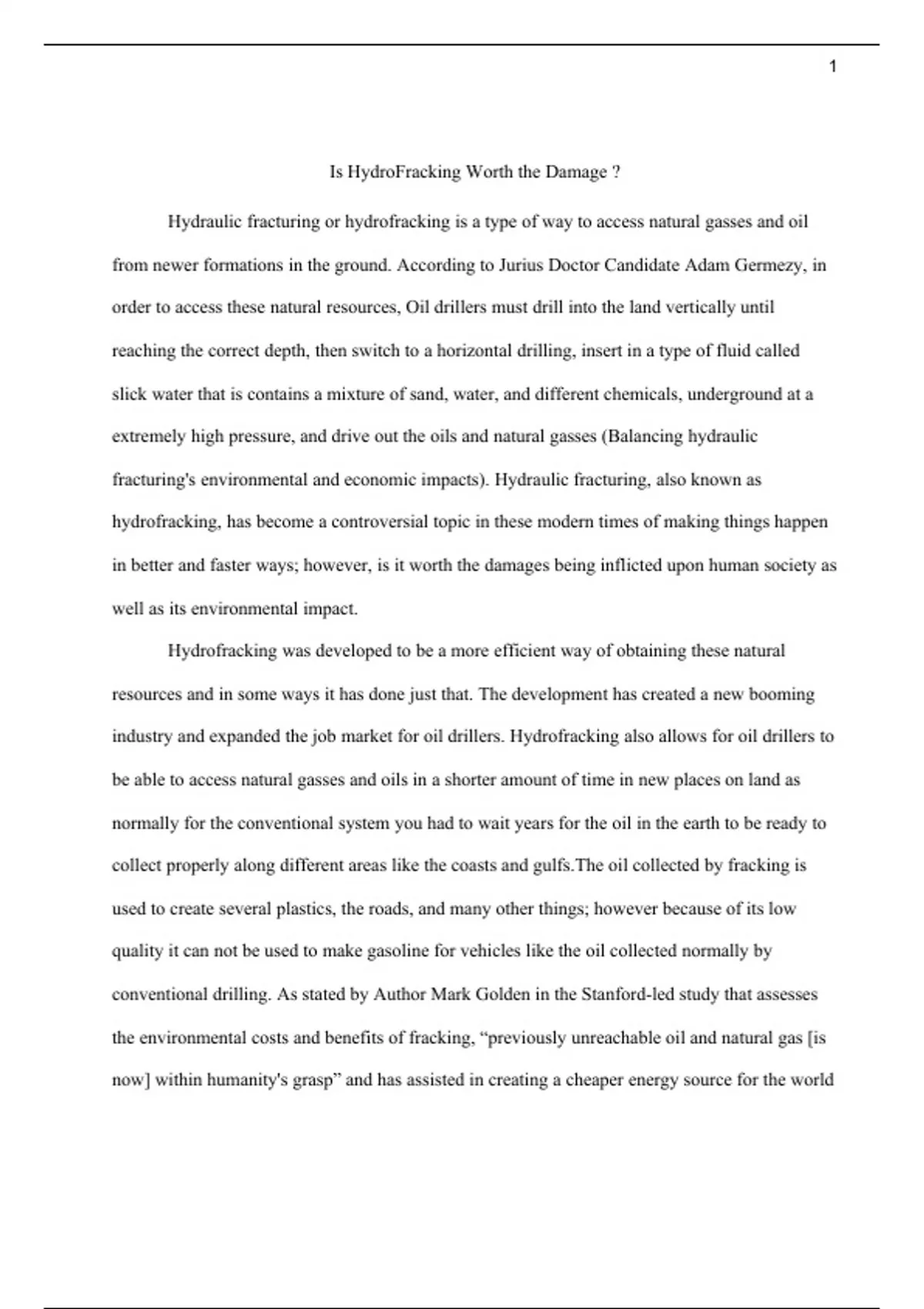 This was a essay that I had decided to write over the affects of Hydrofracking on the Earth as well as if it was something that should be continued. The Assignment was to write a two page essay over something that we had disscussed in class through out the semester.