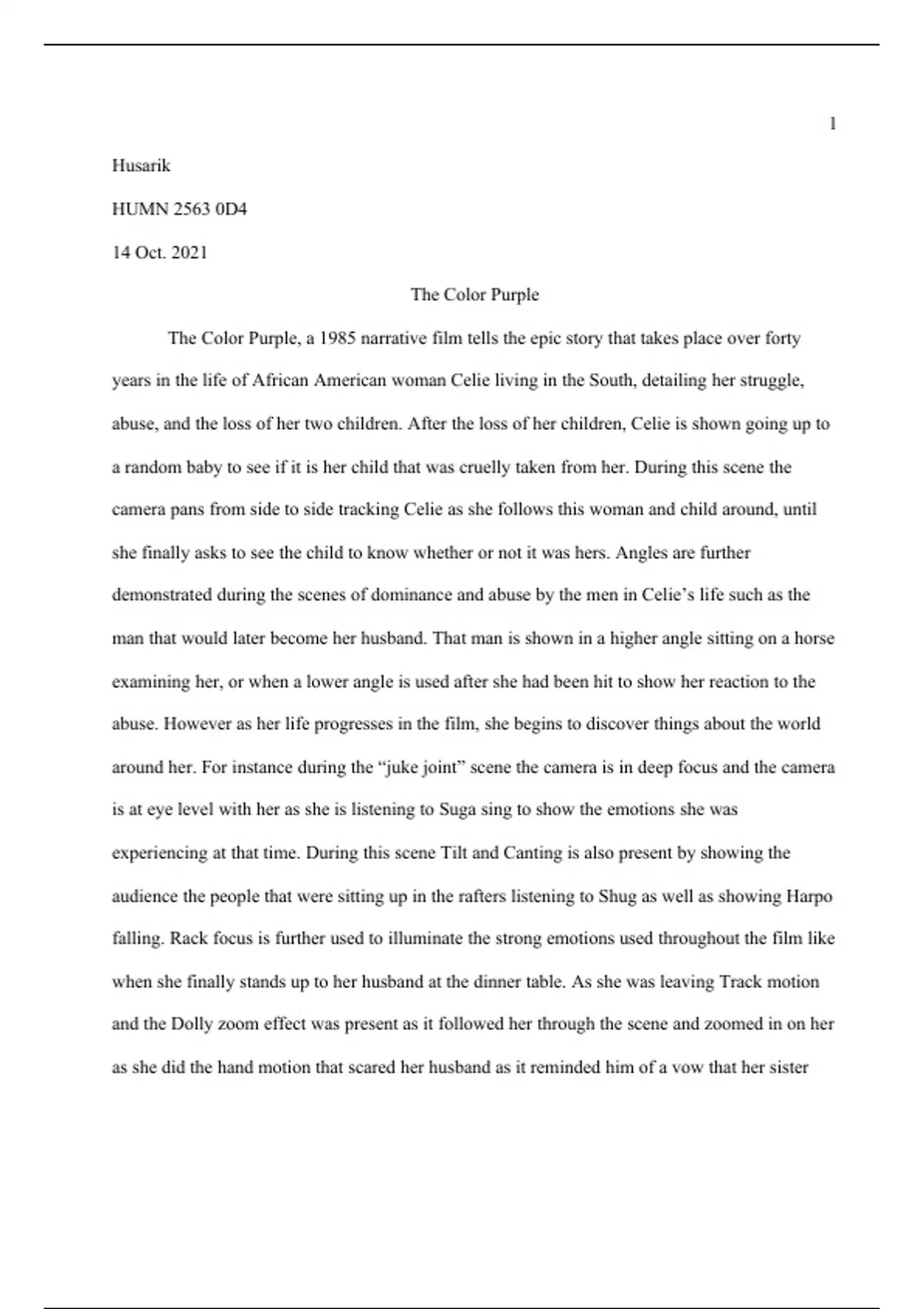 This was a essay that we were required to write. We had to choose a film to analyize and write about from the lis that was given. I chose to write abou thte movie the color purple.