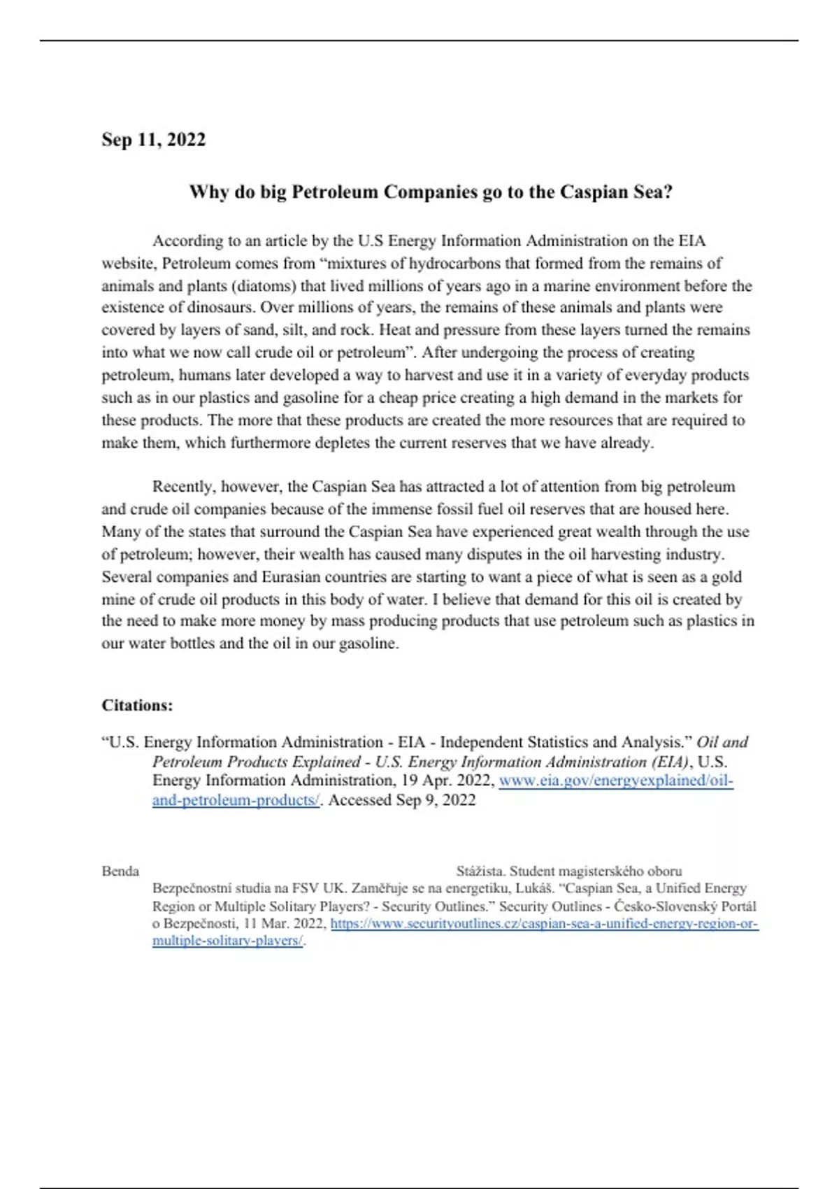 This was a bonus opportunity that I completed for the class over the caspian sea, it was very much a opinion writing. He graded quite easily.