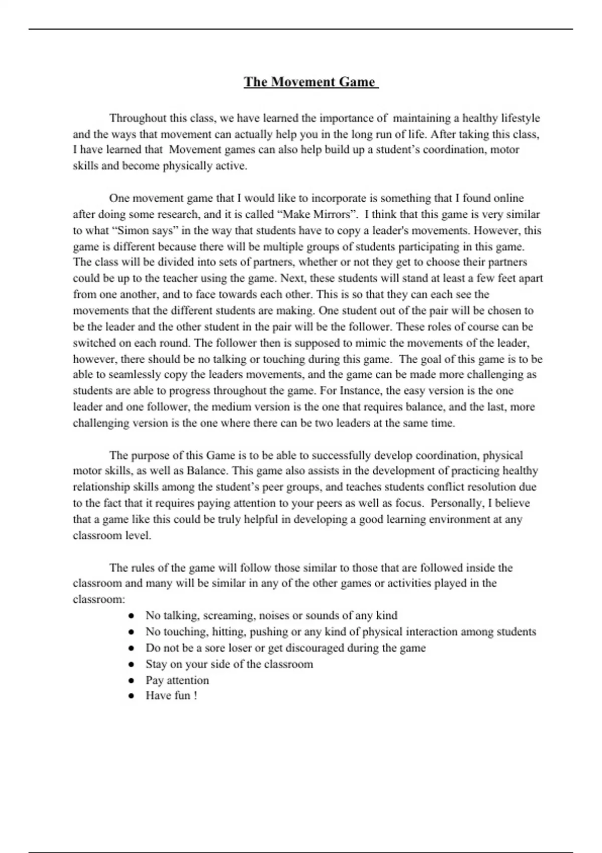This assignment was given in my health and wellness class, to get us to create a game that we could use in the classroom to help with our classroom management