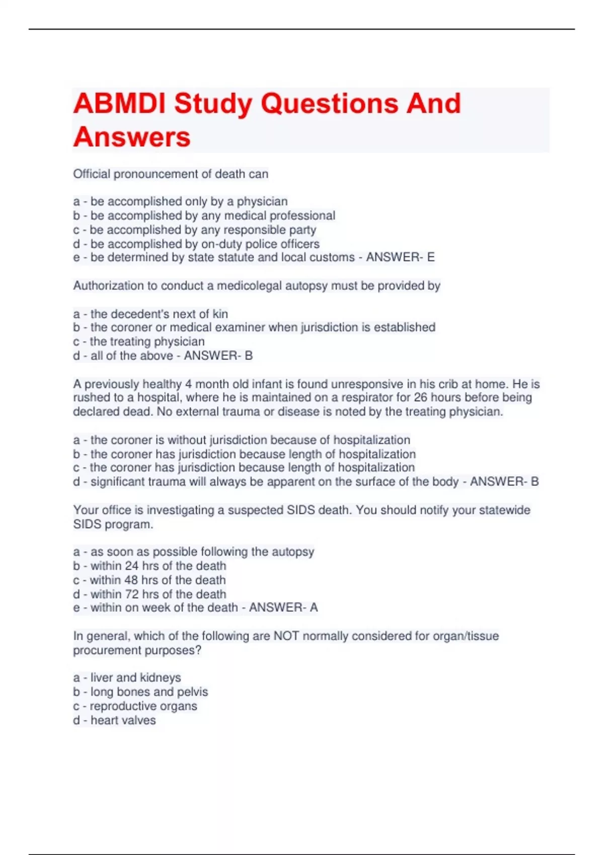 ABMDI Study Questions And Answers Official pronouncement of death can a - be accomplished only by a physician b - be accomplished by any medical professional c - be accomplished by any responsible party d - be accomplished by on-duty police officers e - be determined by state statute and local customs - ANSWER- E Authorization to conduct a medicolegal autopsy must be provided by a - the decedent's next of kin b - the coroner or medical examiner when jurisdiction is established c - the treating physician d - all of the above - ANSWER- B A previously healthy 4 month old infant is found unresponsive in his crib at home. He is rushed to a hospital, where he is maintained on a respirator for 26 hours before being declared dead. No external trauma or disease is noted by the treating physician. a - the coroner is without jurisdiction because of hospitalization b - the coroner has jurisdiction because length of hospitalization c - the coroner has jurisdiction because length of hospitalization d - significant trauma will always be apparent on the surface of the body - ANSWER- B Your office is investigating a suspected SIDS death. You should notify your statewide SIDS program. a - as soon as possible following the autopsy b - within 24 hrs of the death c - within 48 hrs of the death d - within 72 hrs of the death e - within on week of the death - ANSWER- A In general, which of the following are NOT normally considered for organ/tissue procurement purposes? a - liver and kidneys b - long bones and pelvis c - reproductive organs d - heart valves e - pancreas and skin - ANSWER- C Authorization for organ/tissue procurement is considered valid if a = a donor designation appears on the decedent's driver's license b - a donor card with the decedent's name is found in his/her wallet or purse. c - an emergency room physician give permission d - the decedent's legal next of kin or representative has given consent e - no legal next of kin can be found - ANSWER- D The death investigator and police officer arrive at the scene within minutes of each other a - the police officer is in charge and directs the work b - the death investigator is in charge and directs the work c - the best approach is a "team" approach to performing the work d - each has specific responsibilities to perform, and they should not interact e - work together only if necessary; you represent different agencies - ANSWER- C In constructing a narrative report, the main idea is to relate a - your involvement in the case b - the main reason for the death c - an overall and concise view of what happened d - how the deceased was identified e - background information regarding the condition of the body - ANSWER- C Choose one of the MOST important communication skills for gathering information at the scene a - talk to all neighbors b - listen and actively study witnesses c - write down your thoughts d - avoid eye contact with suspects e - none of the above - ANSWER- B The pathologist must be alerted to religious requests from the family a - before the victim's body is taken from the hospital b - after the autopsy, before the body is taken to the funeral home c - only if the religion requires it d - before the autopsy is performed e - before the victim's body is taken from the scene - ANSWER- D A new investigator comes to you with questions regarding a case he is investigating. In what manner should you assist this person with his questions? a - advise the investigator to go to the library b - answer the investigator's question and provide references and resources c - advise the investigator to check the chapter on this subject in the textbook that he got when he went to school d - advise the investigator to check with other staff e - advise the investigator to discuss the case with a forensic pathologist - ANSWER- B A supervisor must allow his employees to undertake difficult investigations in order to grow in experience and confidence. The supervisor dose this by a - allowing employees to fail and criticizing them in front of others b - rarely tackling difficult investigations on his own but delegating them to subordinates c - allowing employees to successfully complete investigations and then taking the credit d - being available to offer advice to employees, as needed e - not criticizing employees for any mistakes but pointing out employee's mistakes to their peers so that they will not make the same mistake - ANSWER- D One way for a supervisor to get personnel to meet agency goals is to a - encourage personnel to participate in planning how to reach those goals and see that they receive credit for their ideas b - make sure the goals are not too far reaching and posted on the wall of the lounge or place where all employees have access c - Refer them to human resources for advic