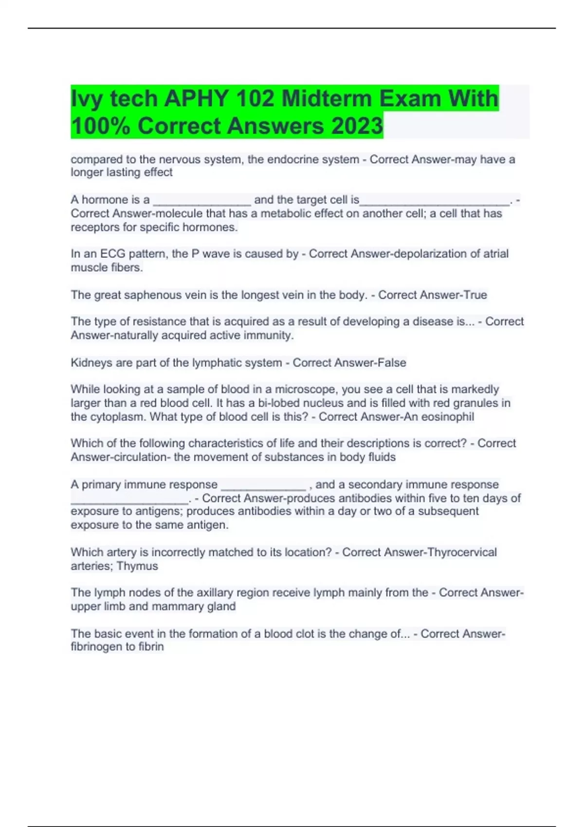 ivy tech aphy 102 midterm exam with 100 correct a