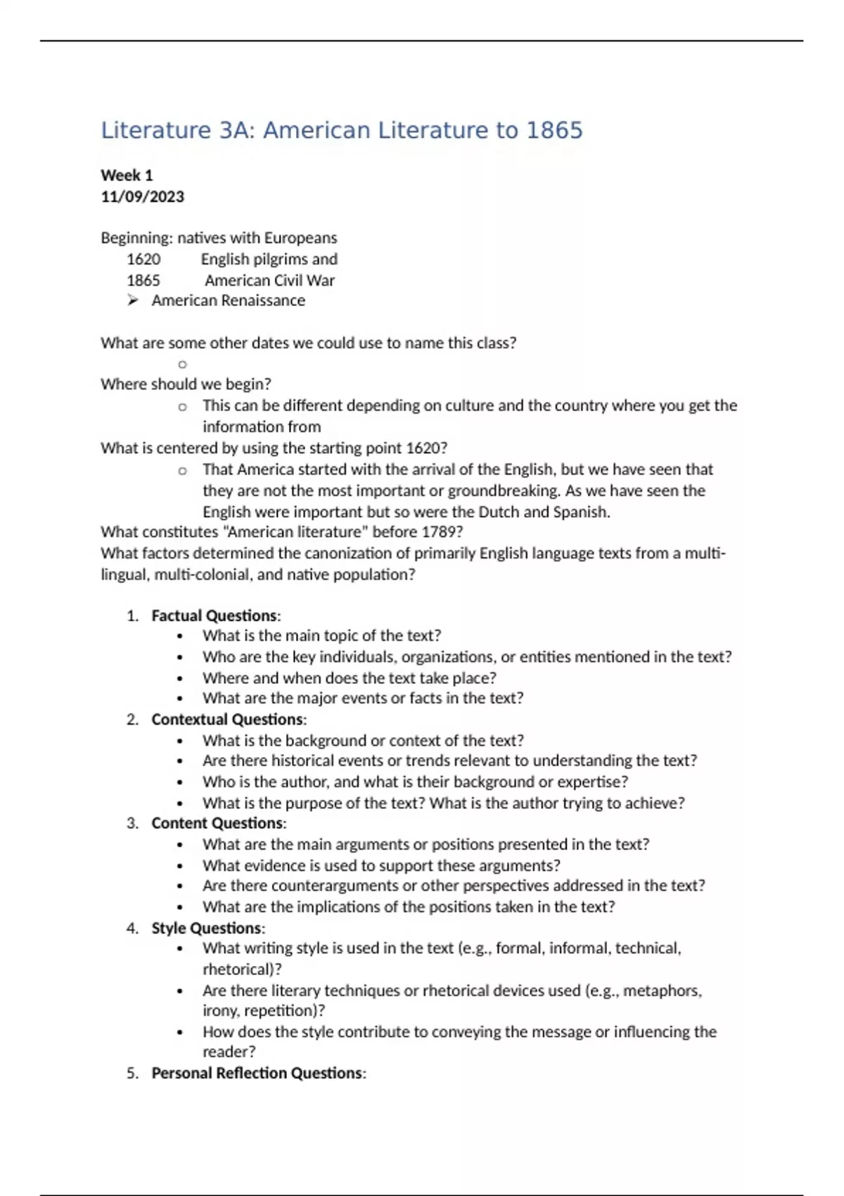 Literature 3A: American Literature to 1865