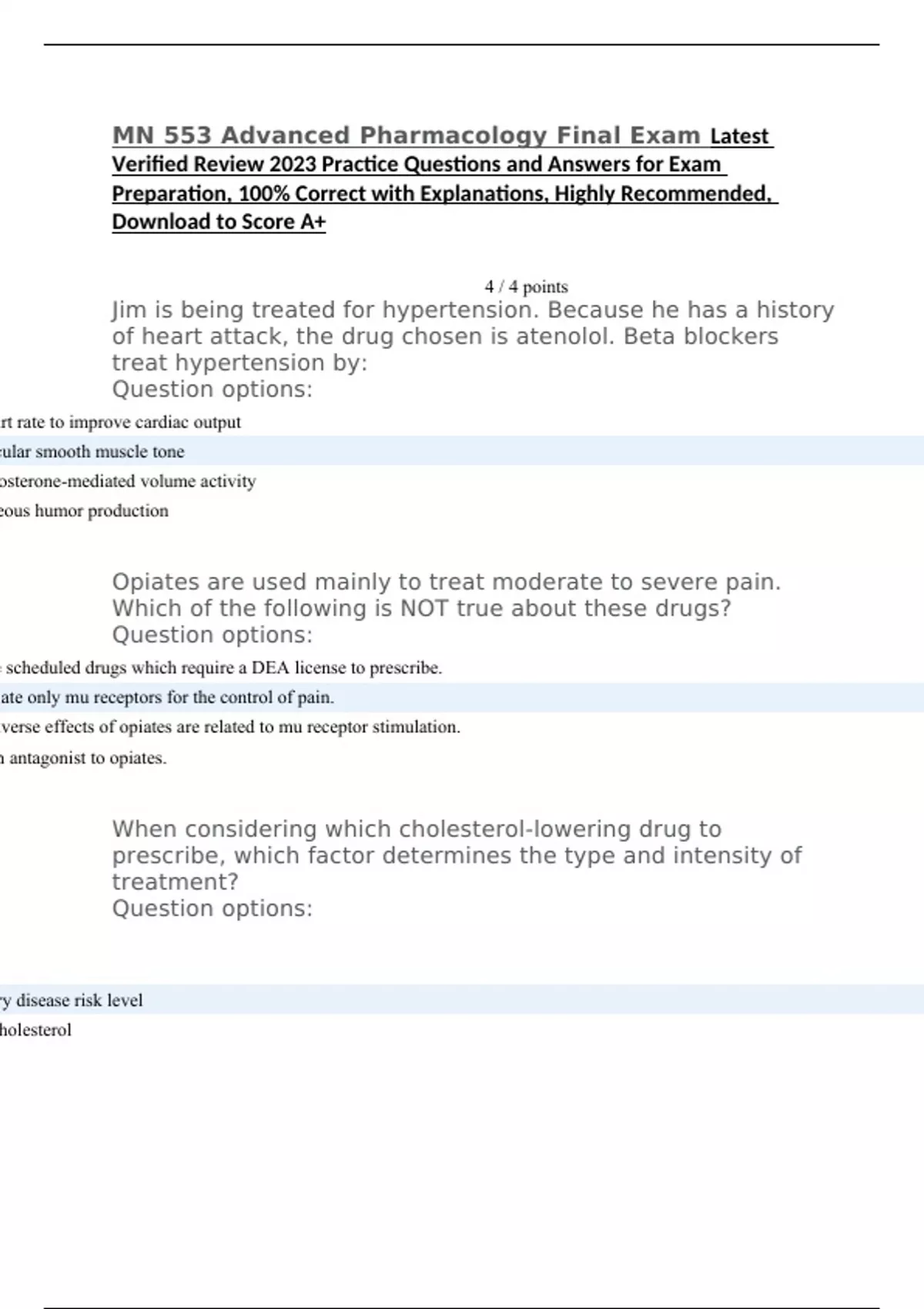 MN 553 Advanced Pharmacology Final Exam Latest Verified Review 2023 Practice Questions and Answers for Exam Preparation, 100% Correct with Explanations, Highly Recommended, Download to Score A+ Jim is being treated for hypertension. Because he has a history of heart attack, the drug chosen is atenolol. Beta blockers treat hypertension by: Question options: Increasing heart rate to improve cardiac output Reducing vascular smooth muscle tone Increasing aldosterone-mediated volume activity Reducing aqueous humor production Question 2 4 / 4 points Opiates are used mainly to treat moderate to severe pain. Which of the following is NOT true about these drugs? Question options: All opiates are scheduled drugs which require a DEA license to prescribe. Opiates stimulate only mu receptors for the control of pain. Most of the adverse effects of opiates are related to mu receptor stimulation. Naloxone is an antagonist to opiates. Question 3 4 / 4 points When considering which cholesterol-lowering drug to prescribe, which factor determines the type and intensity of treatment? Question options: Total LDL Fasting HDL Coronary artery disease risk level Fasting total cholesterol Question 4 4 / 4 points Being competent in the use of information technology in clinical practice is expected in professional nurses. Advanced practice competence includes the ability to: Question options: Search for information using the most common search engines Serve as content experts in developing, implementing, and evaluating information Systems Write programs to assure the integrity of health information Use information technology to prescribe drugs Question 5 4 / 4 points The New York Heart Association and the Canadian Cardiovascular Society have described grading criteria for levels of angina. Angina that occurs with unusually strenuous activity or on walking or climbing stair after meals is class: Question options: I II III IV Question 6 4 / 4 points An Investigational New Drug is filed with the U.S. Food and Drug Administration: Question options: When the manufacturer has completed phase III trials When a new drug is discovered Prior to animal testing of any new drug entity Prior to human testing of any new drug entity Question 7 4 / 4 points True contraindications to diphtheria, tetanus, and acellular pertussis (DTaP or Tdap) vaccine include: Question options: Fever up to 104oF (40.5oC) after previous DTaP vaccine Family history of seizures after DTaP vaccine Adolescent pregnancy Anaphylactic reaction with a previous dose Question 8 4 / 4 points A provider may consider testing for CYP2D6 variants prior to starting tamoxifen for breast cancer to: Question options: Ensure the patient will not have increased adverse drug reactions to the tamoxifen Identify potential drug-drug interactions that may occur with tamoxifen Reduce the likelihood of therapeutic failure with tamoxifen treatment Identify poor metabolizers of tamoxifen Question 9 4 / 4 points Several classes of drugs have interactions with cholinergic blockers. Which of the following is true about these interactions? Question options: Drugs with a narrow therapeutic range given orally may not stay in the GI tract long enough to produce an action. Additive antimuscarinic effects may occur with antihistamines. Cholinergic blockers may decrease the sedative effects of hypnotics. Cholinergic blockers are contraindicated with antipsychotics. Question 10 4 / 4 points Absolute contraindications that clinicians must consider when initiating estrogen therapy include: Question options: Undiagnosed dysfunctional uterine bleeding Deep vein or arterial thromboemboli within the prior year Endometriosis Both a. and b. All of the above