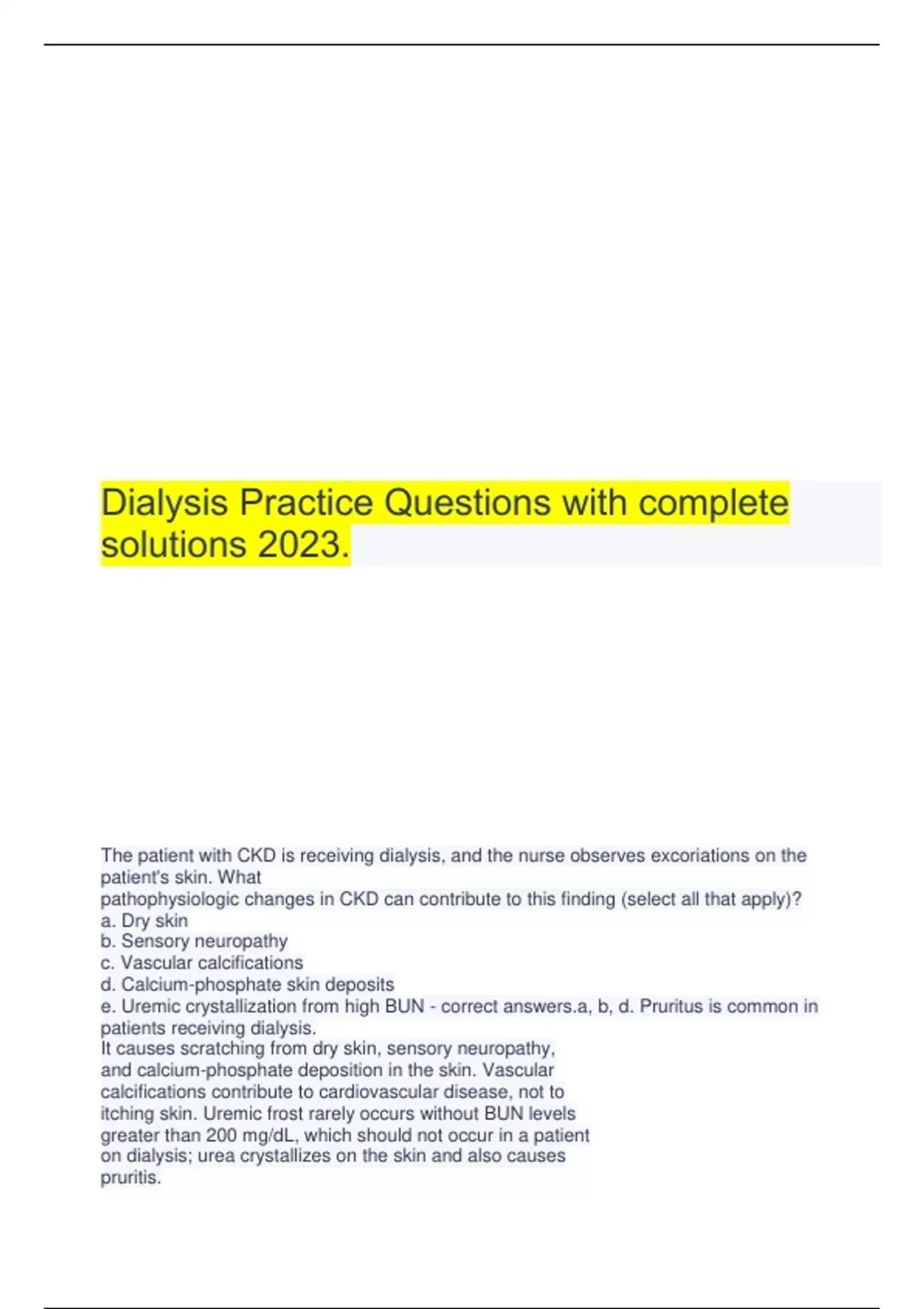 Dialysis Practice Questions with complete solutions 2023. The patient with CKD is receiving dialysis, and the nurse observes excoriations on the patient's skin. What pathophysiologic changes in CKD can contribute to this finding (select all that apply)? a. Dry skin b. Sensory neuropathy c. Vascular calcifications d. Calcium-phosphate skin deposits e. Uremic crystallization from high BUN - correct answers.a, b, d. Pruritus is common in patients receiving dialysis. It causes scratching from dry skin, sensory neuropathy, and calcium-phosphate deposition in the skin. Vascular calcifications contribute to cardiovascular disease, not to itching skin. Uremic frost rarely occurs without BUN levels greater than 200 mg/dL, which should not occur in a patient on dialysis; urea crystallizes on the skin and also causes pruritis. What accurately describes the care of the patient with CKD? a. A nutrient that is commonly supplemented for the patient on dialysis because it is dialyzable is iron. b. The syndrome that includes all of the signs and symptoms seen in the various body systems in CKD is azotemia. c. The use of morphine is contraindicated in the patient with CKD because accumulation of its metabolites may cause seizures. d. The use of calcium-based phosphate binders in the patient with CKD is contraindicated when serum calcium levels are increased. - correct answers.d. In the patient with CKD, when serum calcium levels are increased, calcium-based phosphate binders are not used. The nutrient supplemented for patients on dialysis is folic acid. The various body system manifestations occur with uremia, which includes azotemia. Meperidine is contraindicated in patients with CKD related to possible seizures. The patient with chronic kidney disease is considering whether to use peritoneal dialysis (PD) or hemodialysis (HD). What are advantages of PD when compared to HD (select all that apply)? a. Less protein loss b. Rapid fluid removal c. Less cardiovascular stress d. Decreased hyperlipidemia e. Requires fewer dietary restrictions - correct answers.c, e. Peritoneal dialysis is less stressful for the cardiovascular system and requires fewer dietary restrictions. Peritoneal dialysis actually contributes to more protein loss and increased hyperlipidemia. The fluid and creatinine removal are slower with peritoneal dialysis than hemodialysis. In which type of dialysis does the patient dialyze during sleep and leave the fluid in the abdomen during the day? a. Long nocturnal hemodialysis b. Automated peritoneal dialysis (APD) c. Continuous venovenous hemofiltration (CVVH) d. Continuous ambulatory peritoneal dialysis (CAPD) - correct answers.b. Automated peritoneal dialysis (APD) is the type of dialysis in which the patient dialyzes during sleep and leaves the fluid in the abdomen during the day. Long nocturnal hemodialysis occurs while the patient is sleeping and is done up to six times per week. Continuous venovenous hemofiltration (CVVH) is a type of continuous renal replacement therapy used to treat AKI. Continuous ambulatory peritoneal dialysis (CAPD) is dialysis that is done with exchanges of 1.5 to 3 L of dialysate at least four times daily. To prevent the most common serious complication of PD, what is important for the nurse to do? a. Infuse the dialysate slowly. b. Use strict aseptic technique in the dialysis procedures. c. Have the patient empty the bowel before the inflow phase. d. Reposition the patient frequently and promote deep breathing. - correct answers.b. Peritonitis is a common complication of peritoneal dialysis (PD) and may require catheter removal and termination of dialysis. Infection occurs from contamination of the dialysate or tubing or from progression of exit-site or tunnel infections and strict sterile technique must be used by health professionals as well as the patient to prevent contamination. Too-rapid infusion may cause shoulder pain and pain may be caused if the catheter tip touches the bowel. Difficulty breathing, atelectasis, and pneumonia may occur from pressure of the fluid on the diaphragm, which may be prevented by elevating the head of the bed and promoting repositioning and deep breathing. A patient on hemodialysis develops a thrombus of a subcutaneous arteriovenous (AV) graft, requiring its removal. While waiting for a replacement graft or fistula, the patient is most likely to have what done for treatment? a. Peritoneal dialysis b. Peripheral vascular access using radial artery c. Silastic catheter tunneled subcutaneously to the jugular vein d. Peripherally inserted central catheter (PICC) line inserted into subclavian vein - correct answers.c. A more permanent, soft, flexible Silastic double-lumen catheter is used for long-term access when other forms of vascular access have failed. These catheters are tunneled subcutaneously and have Dacron cuffs that prevent infection from tracking along the catheter. A man with end-stage kidney disease is scheduled for hemodialysis following healing of an arteriovenous fistula (AVF). What should the nurse explain to him that will occur during dialysis? a. He will be able to visit, read, sleep, or watch TV while reclining in a chair. b. He will be placed on a cardiac monitor to detect any adverse effects that might occur. c. The dialyzer will remove and hold part of his blood for 20 to 30 minutes to remove the waste products. d. A large catheter with two lumens will be inserted into the fistula to send blood to and return it from the dialyzer. - correct answers.a. While patients are undergoing hemodialysis, they can perform quiet activities that do not require the limb that has the vascular access. Blood pressure is monitored frequently and the dialyzer monitors dialysis function but cardiac monitoring is not usually indicated. The hemodialysis machine continuously circulates both the blood and the dialysate past the semipermeable membrane in the machine. Graft and fistula access involve the insertion of two needles into the