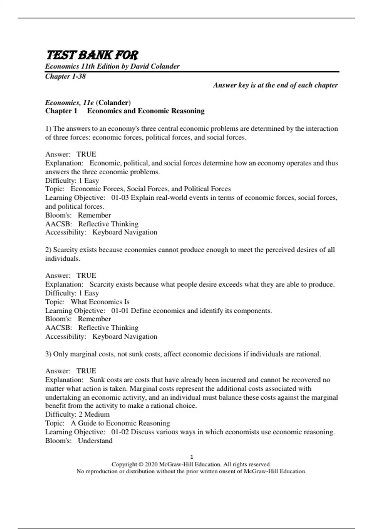 Test Bank for Economics 11th Edition by David Colander Chapter 1-38