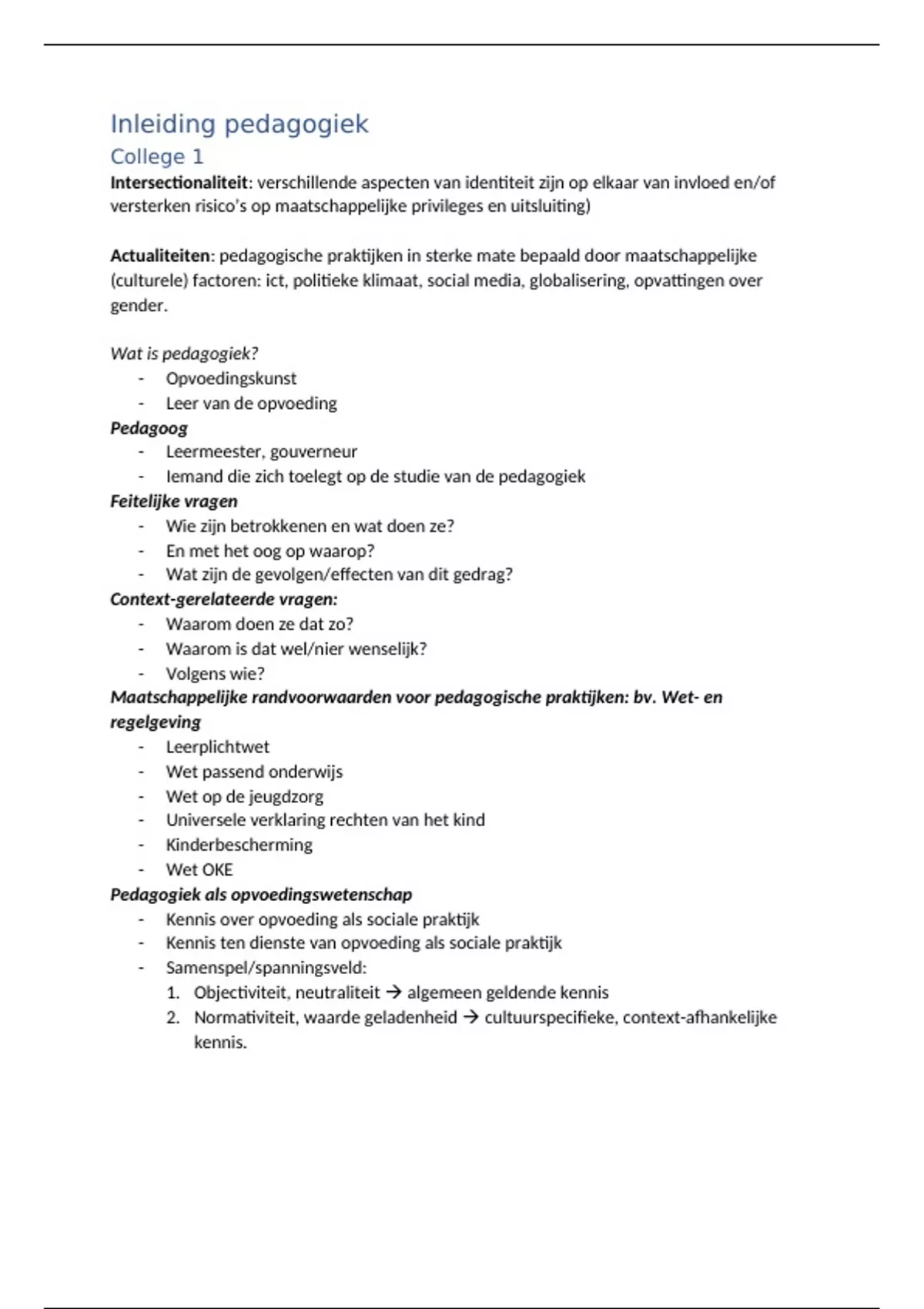 dit document bevat de college aantekeningen van inleiding pedagogiek. Het bevat alle colleges, behalve 11 en 12.