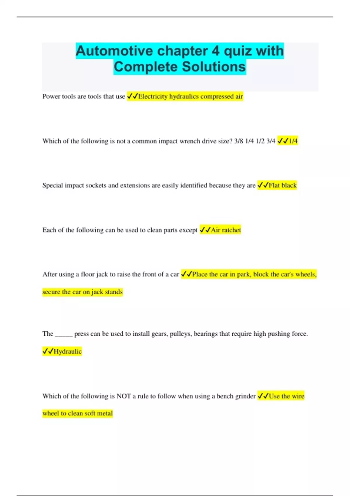Power tools are tools that use Electricity hydraulics compressed air Which of the following is not a common impact wrench drive size? 3/8 1/4 1/2 3/4 1/4 Special impact sockets and extensions are easily identified because they are Flat black Each of the following can be used to clean parts except Air ratchet After using a floor jack to raise the front of a car Place the car in park, block the car's wheels, secure the car on jack stands The _____ press can be used to install gears, pulleys, bearings that require high pushing force. Hydraulic Which of the following is NOT a rule to follow when using a bench grinder Use the wire wheel to clean soft metal