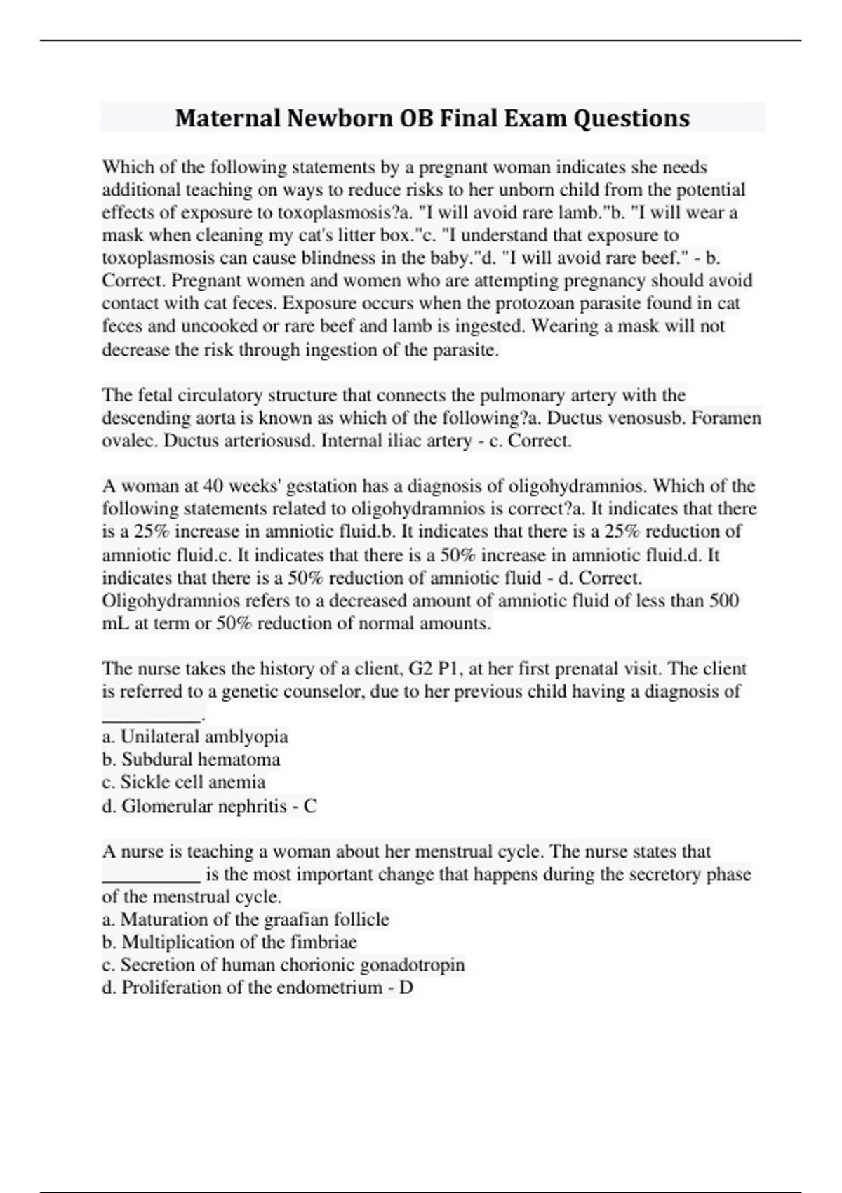 Which of the following statements by a pregnant woman indicates she needs additional teaching on ways to reduce risks to her unborn child from the potential effects of exposure to toxoplasmosis?a. "I will avoid rare lamb."b. "I will wear a mask when cleaning my cat's litter box."c. "I understand that exposure to toxoplasmosis can cause blindness in the baby."d. "I will avoid rare beef." - b. Correct. Pregnant women and women who are attempting pregnancy should avoid contact with cat feces. Exposure occurs when the protozoan parasite found in cat feces and uncooked or rare beef and lamb is ingested. Wearing a mask will not decrease the risk through ingestion of the parasite. The fetal circulatory structure that connects the pulmonary artery with the descending aorta is known as which of the following?a. Ductus venosusb. Foramen ovalec. Ductus arteriosusd. Internal iliac artery - c. Correct. A woman at 40 weeks' gestation has a diagnosis of oligohydramnios. Which of the following statements related to oligohydramnios is correct?a. It indicates that there is a 25% increase in amniotic fluid.b. It indicates that there is a 25% reduction of amniotic fluid.c. It indicates that there is a 50% increase in amniotic fluid.d. It indicates that there is a 50% reduction of amniotic fluid - d. Correct. Oligohydramnios refers to a decreased amount of amniotic fluid of less than 500 mL at term or 50% reduction of normal amounts. The nurse takes the history of a client, G2 P1, at her first prenatal visit. The client is referred to a genetic counselor, due to her previous child having a diagnosis of __________. a. Unilateral amblyopia b. Subdural hematoma c. Sickle cell anemia d. Glomerular nephritis - C A nurse is teaching a woman about her menstrual cycle. The nurse states that __________ is the most important change that happens during the secretory phase of the menstrual cycle. a. Maturation of the graafian follicle b. Multiplication of the fimbriae c. Secretion of human chorionic gonadotropin d. Proliferation of the endometrium - DAn ultrasound of a fetus' heart shows that "normal fetal circulation is occurring." Which of the following statements is consistent with the finding? a. A right to left shunt is seen between the atria. b. Blood is returning to the placenta via the umbilical vein. c. Blood is returning to the right atrium from the pulmonary system. d. A right to left shunt is seen between the umbilical arteries. - A The clinic nurse knows that the part of the endometrial cycle occurring from ovulation to just prior to menses is known as the: a. Menstrual phase b. Proliferative phase c. Secretory phase d. Ischemic phase - C A clinic nurse explains to the pregnant woman that the amount of amniotic fluid present at 24 weeks' gestation is approximately: a. 500 mL b. 750 mL c. 800 mL d. 1000 mL - C Information provided by the nurse that addresses the function of the amniotic fluid is that the amniotic fluid helps the fetus to maintain a normal body temperature and also: a. Facilitates asymmetrical growth of the fetal limbs b. Cushions the fetus from mechanical injury c. Promotes development of muscle tone d. Promotes adherence of fetal lung tissue - B During preconception counseling, the clinic nurse explains that the time period when the fetus is most vulnerable to the effects of teratogens occurs from: a. 2 to 8 weeks b. 4 to12 weeks c. 5 to 10 weeks d. 6 to 15 weeks - A A major fetal development characteristic at 16 weeks' gestation is: a. The average fetal weight is 450 grams b. Lanugo covers entire bodyc. Brown fat begins to develop d. Teeth begin to form - D A couple who has sought infertility counseling has been told that the man's sperm count is very low. The nurse advises the couple that spermatogenesis is impaired when which of the following occur? a. The testes are overheated. b. The vas deferens is ligated. c. The prostate gland is enlarged. d. The flagella are segmented. - A The perinatal nurse explains to the student nurse that in the fetal circulation, the lowest level of oxygen concentration is found in the umbilical arteries. - True