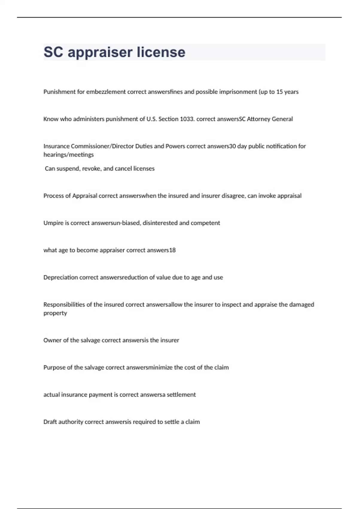 Punishment for embezzlement correct answersfines and possible imprisonment (up to 15 years Know who administers punishment of U.S. Section 1033. correct answersSC Attorney General Insurance Commissioner/Director Duties and Powers correct answers30 day public notification for hearings/meetings Can suspend, revoke, and cancel licenses Process of Appraisal correct answerswhen the insured and insurer disagree, can invoke appraisal Umpire is correct answersun-biased, disinterested and competent what age to become appraiser correct answers18 Depreciation correct answersreduction of value due to age and use Responsibilities of the insured correct answersallow the insurer to inspect and appraise the damaged property Owner of the salvage correct answersis the insurer Purpose of the salvage correct answersminimize the cost of the claim actual insurance payment is correct answersa settlement Draft authority correct answersis required to settle a claim
