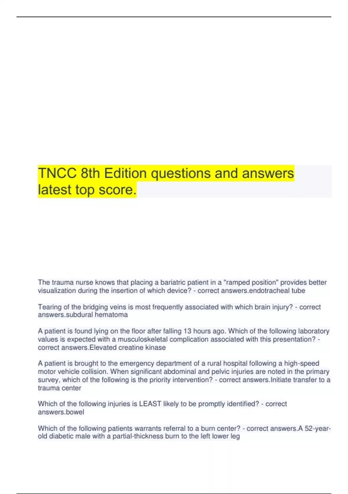 TNCC 8th Edition questions and answers latest top score. The trauma nurse knows that placing a bariatric patient in a "ramped position" provides better visualization during the insertion of which device? - correct racheal tube Tearing of the bridging veins is most frequently associated with which brain injury? - correct ral hematoma A patient is found lying on the floor after falling 13 hours ago. Which of the following laboratory values is expected with a musculoskeletal complication associated with this presentation? - correct answers.Elevated creatine kinase A patient is brought to the emergency department of a rural hospital following a high-speed motor vehicle collision. When significant abdominal and pelvic injuries are noted in the primary survey, which of the following is the priority intervention? - correct answers.Initiate transfer to a trauma center Which of the following injuries is LEAST likely to be promptly identified? - correct Which of the following patients warrants referral to a burn center? - correct answers.A 52-year-old diabetic male with a partial-thickness burn to the left lower leg A patient has been in the emergency department for several hours waiting to be admitted. He sustained multiple rib fractures and a femur fracture after a fall. He has been awake, alert, and complaining of leg pain. His wife reported that he suddenly became anxious and confused. Upon reassessment, the patient is restless, with respiratory distress and petechiae to his neck. The patient is exhibiting signs and symptoms most commonly associated with which of the follow conditions? - correct embolism A 36-year old female has a deformity of the left wrist after a fall. She is reluctant to move her hand due to pain. Which of the following is the most appropriate intervention? - correct answers.Apply a splint and elevate the extremity ABOVE the level of the heart A 56-year-old male patient involved in a motor vehicle crash is brought to the emergency department of a rural critical assess facility. He complaints of neck pain, shortness of breath, and diffuse abdominal pain. His Glasgow Coma Score is 15. His vital signs are as follows: BP 98/71 mm Hg, HR 125 beats/minute, RR 26 breaths/minute, SpO2 94% on high-flow oxygen via non-rebreather mask. Which of the follow is the priority intervention for this patient? - correct answers.Expedite transfer to the closest trauma center Which of the following values indicates the need for alcohol withdrawal interventions? - correct answers.CIWA-Ar of 36 A trauma patient is en route to a rural emergency department. Radiology notifies the charge nurse that the computed tomography (CT) scanner will be out of service for several hours. The team gathers to plan accordingly. Which of the following terms best describes this trauma team's communication? - correct e A patient with a complete spinal cord injury in neurogenic shock will demonstrate hypotension and which other clinical signs? - correct answers.Bradycardia and absent motor function below the level of injury Which of the following is true about the log-roll maneuver? - correct answers.It can worsen cord damage from a unstable spinal injury What factor contributes most to the kinetic energy of a body in motion? - correct ity A 5-year-old child presents to the ED with bruises to the upper arms and buttocks in various stages of healing and multiple small, clean, round burns to the back. There are no abnormalities found based on the pediatric assessment triangle or primary survey. Which of the following is the priority nursing intervention? - correct answers.Report your suspicion of maltreatment in accordance with local regulations A 20-year-old male presents to the ED complaining of severe lower abdominal pain after landing hard on the bicycle cross bars while performing an aerial BMX maneuver. Secondary assessment reveals lower abdominal tenderness and scrotal ecchymosis. Which of the following orders would the nurse question? - correct answers.Straight catheter for urine sample You are caring for a patient who was involved in a motor vehicle crash and is 32 weeks pregnant. Findings of your secondary survey include abdominal pain on palpation, fundal height at the costal margin, and some dark bloody show. Varying accelerations and decelerations are note don cardiotocography. These findings are most consistent with which of the following? - correct ntal abruption