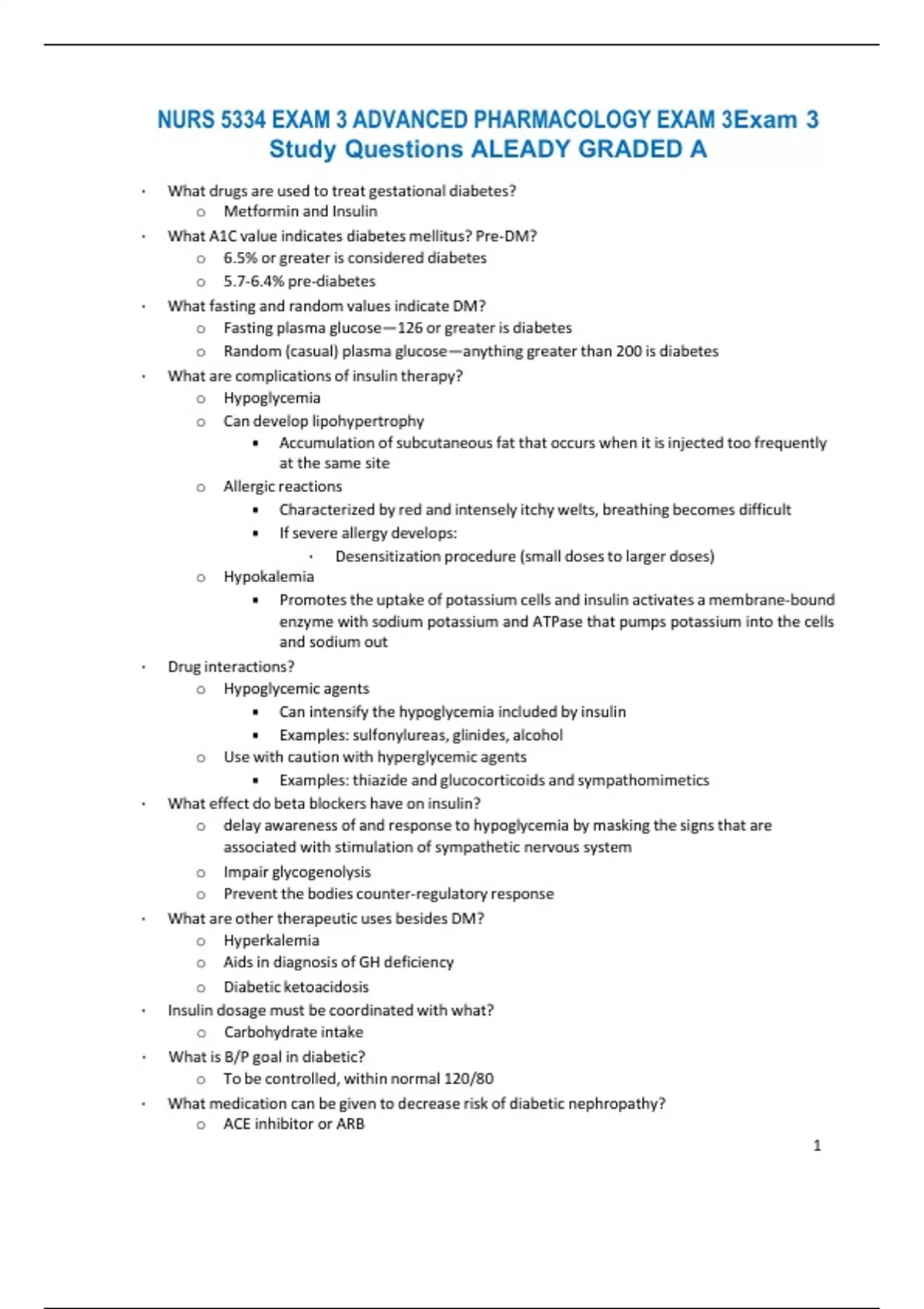 NURS 5334 EXAM 3 ADVANCED PHARMACOLOGY EXAM 3Exam 3 Study Questions ALEADY GRADED A • What drugs are used to treat gestational diabetes?