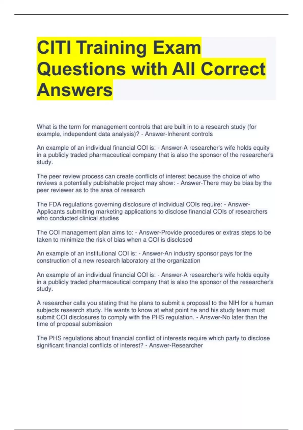 CITI Training Exam Questions with All Correct Answers What is the term for management controls that are built in to a research study (for example, independent data analysis)? - Answer-Inherent controls An example of an individual financial COI is: - Answer-A researcher's wife holds equity in a publicly traded pharmaceutical company that is also the sponsor of the researcher's study. The peer review process can create conflicts of interest because the choice of who reviews a potentially publishable project may show: - Answer-There may be bias by the peer reviewer as to the area of research The FDA regulations governing disclosure of individual COIs require: - Answer-Applicants submitting marketing applications to disclose financial COIs of researchers who conducted clinical studies The COI management plan aims to: - Answer-Provide procedures or extras steps to be taken to minimize the risk of bias when a COI is disclosed An example of an institutional COI is: - Answer-An industry sponsor pays for the construction of a new research laboratory at the organization An example of an individual financial COI is: - Answer-A researcher's wife holds equity in a publicly traded pharmaceutical company that is also the sponsor of the researcher's study. A researcher calls you stating that he plans to submit a proposal to the NIH for a human subjects research study. He wants to know at what point he and his study team must submit COI disclosures to comply with the PHS regulation. - Answer-No later than the time of proposal submission