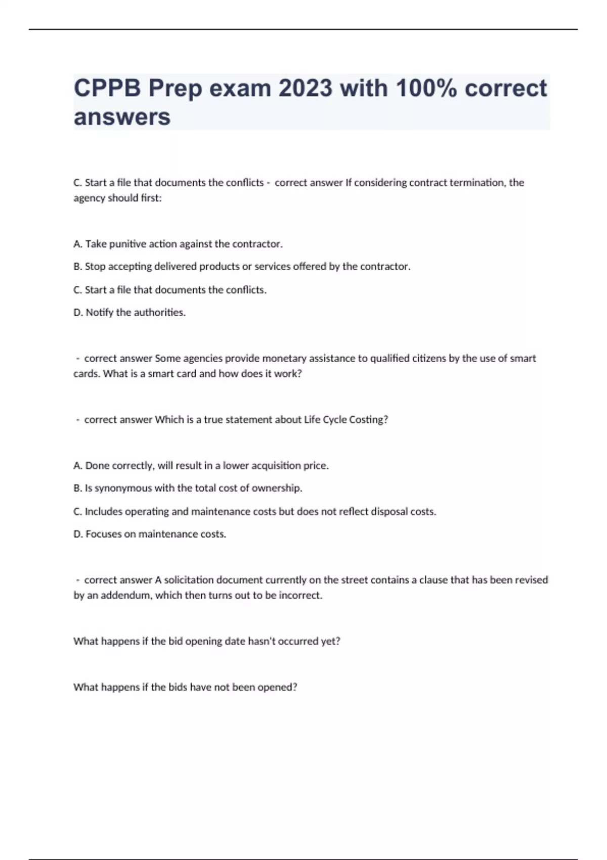 C. Start a file that documents the conflicts - correct answer If considering contract termination, the agency should first: A. Take punitive action against the contractor. B. Stop accepting delivered products or services offered by the contractor. C. Start a file that documents the conflicts. D. Notify the authorities. - correct answer Some agencies provide monetary assistance to qualified citizens by the use of smart cards. What is a smart card and how does it work? - correct answer Which is a true statement about Life Cycle Costing? A. Done correctly, will result in a lower acquisition price. B. Is synonymous with the total cost of ownership. C. Includes operating and maintenance costs but does not reflect disposal costs. D. Focuses on maintenance costs. - correct answer A solicitation document currently on the street contains a clause that has been revised by an addendum, which then turns out to be incorrect. What happens if the bid opening date hasn't occurred yet? What happens if the bids have not been opened? Minor irregularites - correct answer Failure of a bidder to return the number of signed copies requested, failure of a bidder to acknowledge receipt of an addendum or failure to execute a required certificate are often considered: A. Deal-breakers B. Responsiveness issues C. Minor irregularities D. Major irregu