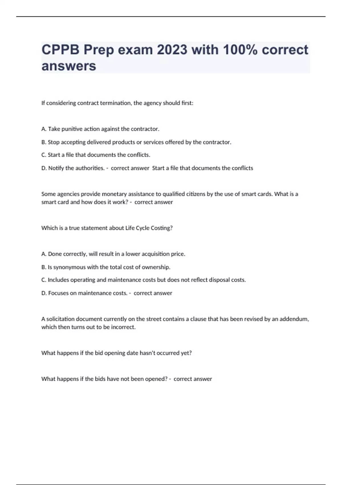 If considering contract termination, the agency should first: A. Take punitive action against the contractor. B. Stop accepting delivered products or services offered by the contractor. C. Start a file that documents the conflicts. D. Notify the authorities. - correct answer Start a file that documents the conflicts Some agencies provide monetary assistance to qualified citizens by the use of smart cards. What is a smart card and how does it work? - correct answer Which is a true statement about Life Cycle Costing? A. Done correctly, will result in a lower acquisition price. B. Is synonymous with the total cost of ownership. C. Includes operating and maintenance costs but does not reflect disposal costs. D. Focuses on maintenance costs. - correct answer A solicitation document currently on the street contains a clause that has been revised by an addendum, which then turns out to be incorrect. What happens if the bid opening date hasn't occurred yet? What happens if the bids have not been opened? - correct answer Failure of a bidder to return the number of signed copies requested, failure of a bidder to acknowledge receipt of an addendum or failure to execute a required certificate are often considered: A. Deal-breakers B. Responsiveness issues C. Minor irregularities D. Major irregularities - correct answer Minor irregularites You've opened some bids and identified the lowest responsive/responsible bidder. However, due to internal i