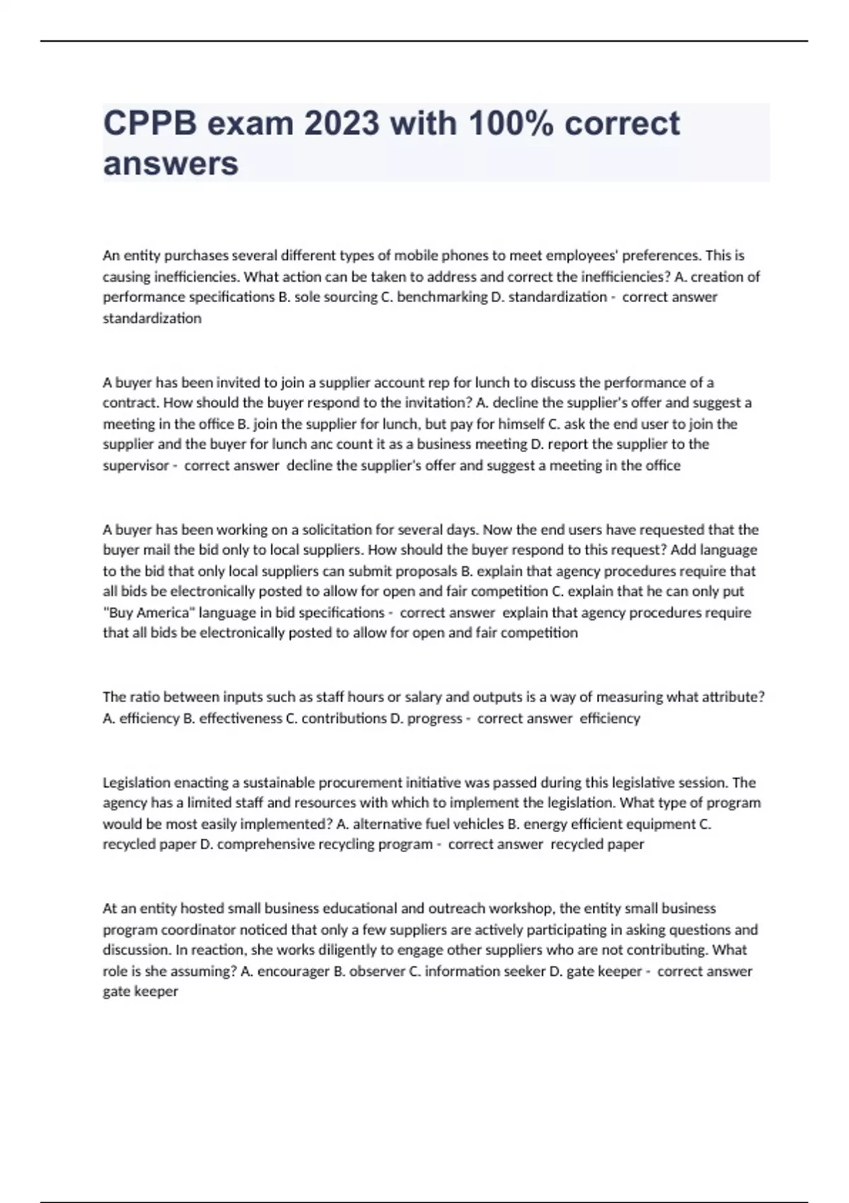 An entity purchases several different types of mobile phones to meet employees' preferences. This is causing inefficiencies. What action can be taken to address and correct the inefficiencies? A. creation of performance specifications B. sole sourcing C. benchmarking D. standardization - correct answer standardization A buyer has been invited to join a supplier account rep for lunch to discuss the performance of a contract. How should the buyer respond to the invitation? A. decline the supplier's offer and suggest a meeting in the office B. join the supplier for lunch, but pay for himself C. ask the end user to join the supplier and the buyer for lunch anc count it as a business meeting D. report the supplier to the supervisor - correct answer decline the supplier's offer and suggest a meeting in the office A buyer has been working on a solicitation for several days. Now the end users have requested that the buyer mail the bid only to local suppliers. How should the buyer respond to this request? Add language to the bid that only local suppliers can submit proposals B. explain that agency procedures require that all bids be electronically posted to allow for open and fair competition C. explain that he can only put "Buy America" language in bid specifications - correct answer explain that agency procedures require that all bids be electronically posted to allow for open and fair competition The ratio between inputs such as staff hours or salary and outputs is a way of measuring what attribute? A. efficiency B. effectiveness C. contributions D. progress - correct answer efficiency Legislation enacting a sustainable procurement initiative was passed during this legislative session. The agency has a limited staff and resources with which to implement the legislation. What type of program would be most easily implemented? A. alternative fuel vehicles B. energy efficient equipment C. recycled paper D. comprehensive recycling program - correct answer recycled paper At an entity hosted small business educational and outreach workshop, the entity small business program coordinator noticed that only a few suppliers are actively participating in asking questions and discussion. In reaction, she works diligently to engage other suppliers who are not contributing. What role is she assuming? A. encourager B. observer C. information seeker D. gate keeper - correct answer gate keeper