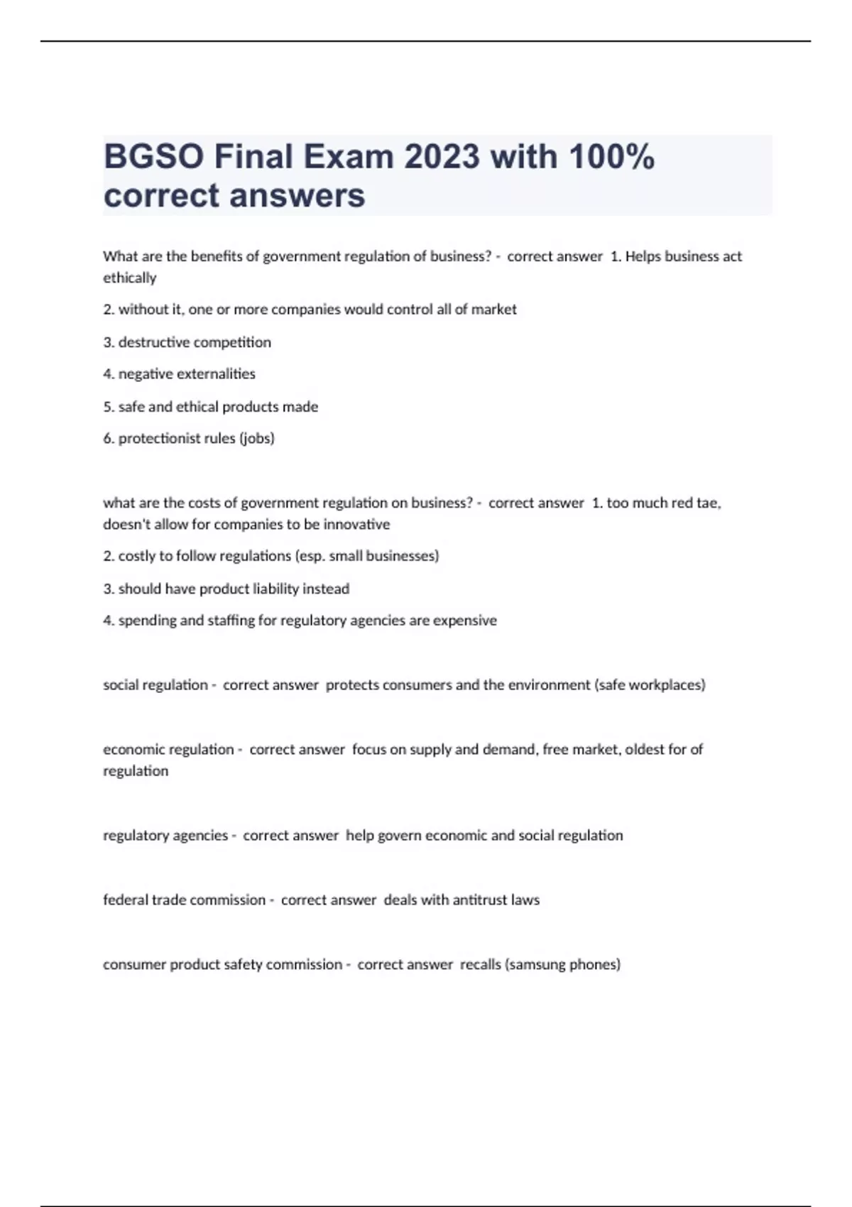 What are the benefits of government regulation of business? - correct answer 1. Helps business act ethically 2. without it, one or more companies would control all of market 3. destructive competition 4. negative externalities 5. safe and ethical products made 6. protectionist rules (jobs) what are the costs of government regulation on business? - correct answer 1. too much red tae, doesn't allow for companies to be innovative 2. costly to follow regulations (esp. small businesses) 3. should have product liability instead 4. spending and staffing for regulatory agencies are expensive social regulation - correct answer protects consumers and the environment (safe workplaces) economic regulation - correct answer focus on supply and demand, free market, oldest for of regulation regulatory agencies - correct answer help govern economic and social regulation federal trade commission - correct answer deals with antitrust laws consumer product safety commission - correct answer recalls (samsung phones) food and drug admi