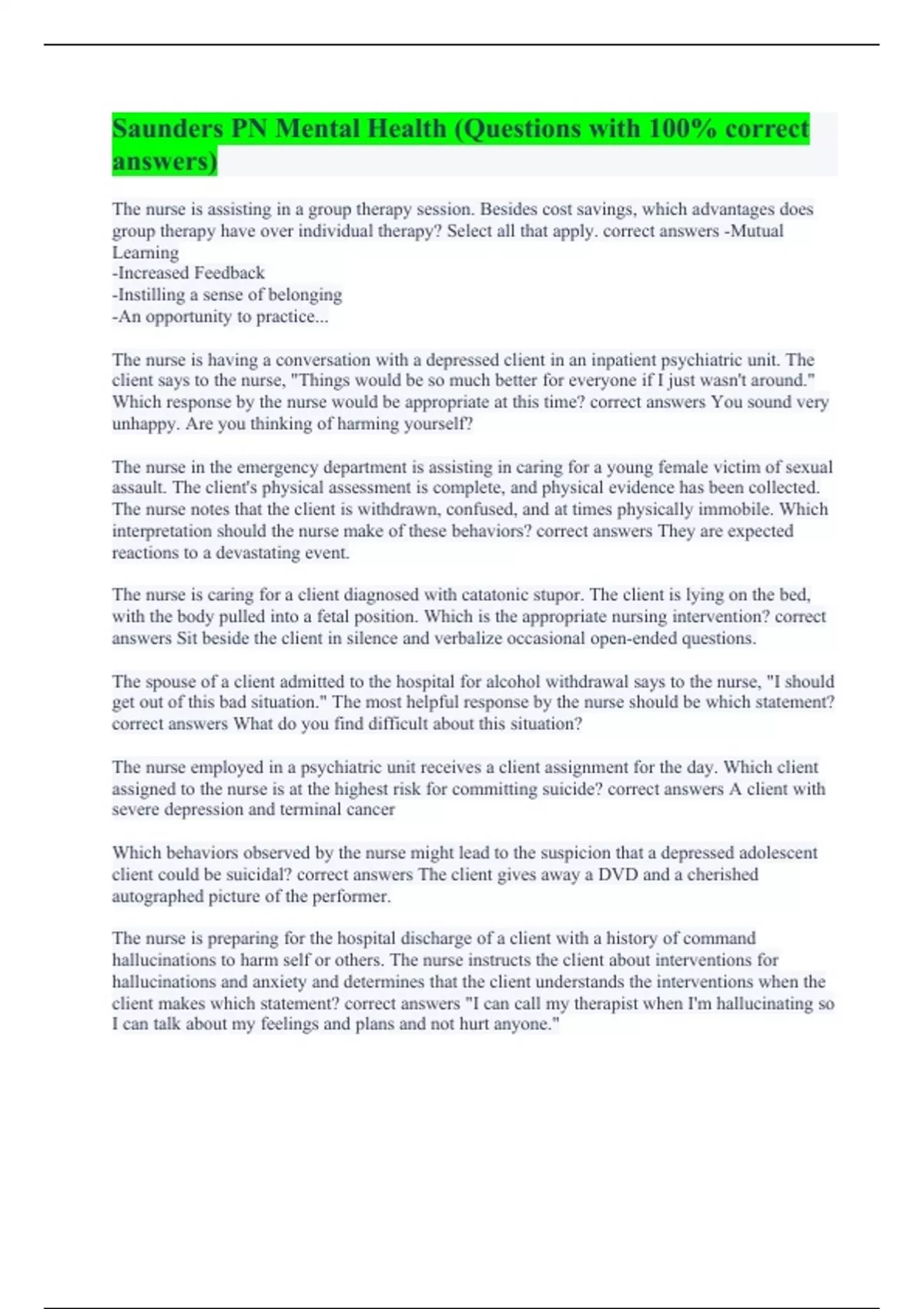 Saunders PN Mental Health (Questions with 100% correct answers)