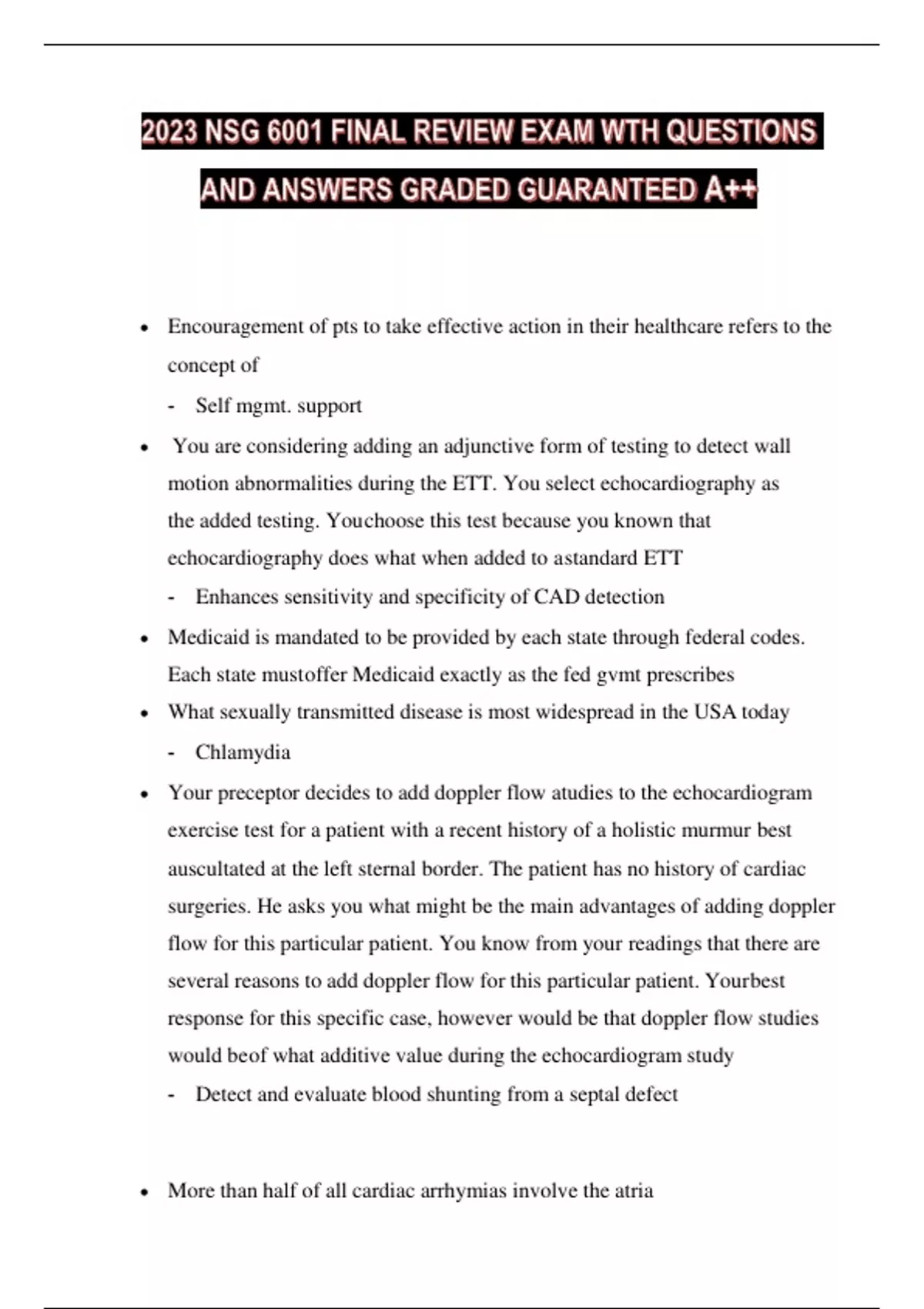 2023 NSG 6001 FINAL REVIEW EXAM WTH QUESTIONS AND ANSWERS GRADED GUARANTEED A++. Encouragement of pts to take effective action in their healthcare refers to the concept of - Self mgmt. support You are considering adding an adjunctive form of testing to detect wall motion abnormalities during the ETT. You select echocardiography as the added testing. You choose this test because you known that echocardiography does what when added to a standard ETT - Enhances sensitivity and specificity of CAD detection Medicaid is mandated to be provided by each state through federal codes. Each state must offer Medicaid exactly as the fed gvmt prescribes What sexually transmitted disease is most widespread in the USA today - Chlamydia Your preceptor decides to add doppler flow atudies to the echocardiogram exercise test for a patient with a recent history of a holistic murmur best auscultated at the left sternal border. The patient has no history of cardiac surgeries. He asks you what might be the main advantages of adding doppler flow for this particular patient. You know from your readings that there are several reasons to add doppler flow for this particular patient. Your best response for this specific case, however would be that doppler flow studies would be of what additive value during the echocardiogram study - Detect and evaluate blood shunting from a septal defect More than half of all cardiac arrhymias involve the atria - True What are the most common symptoms caused by tachyarryhthmias - Palpitations For women with known cad and diabetes, which is the most appropriate to assess CAD risk - ETT with imaging Of the following, which is the best answer when asked about the advantage of echocardiogram exercise testing over thallium stress testing - Results are available more quickly You patient has uncomplicated pyelonephritis. In deciding your recommended treatment, you consider the most common pathogenic reason for this diagnosis. What pathogen accounts for the majority of pyelonephritis? - E coli What purpose does the principle of fidelity serve - Ensures that providers honor their committement to the patient In CAD after both systolic and diastolic dysfunction have occurred. The typical pattern of chest pain and related EKG changes occur. During an ekg you should expect to see ST segment and T wave changes that are central to demonstration of ischemia occurring relatively late in the ischemic cascade is this true or false - True The leads on the ECG showing ischemic changes during or immediately after an ETT can correlate roughly to the culprit artery or arteries with significant CAD. Is this true or false - True Skin cancer is the most common malignant neoplasms in males in the us . What is the second leading cause of cancer deaths in men greater than 50 years of age - Prostate cancer What ech changes can reduce the specificity of the ETT - Paced rhythm and resting bundle branch blocks. You have confirmed that your patient does indeed have an abdominal aortic aneurysm. In teaching your patient about symptoms to report immediately to the vascular surgeon you instruct the patient to report which of the following - Back pain or flank pain Which is one of the common causes of a saccular abdominal aneurysm - Trauma