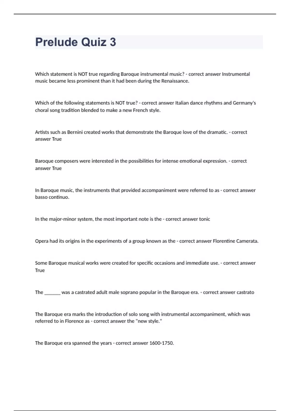 Prelude Quiz 3Which statement is NOT true regarding Baroque instrumental music? - correct answer Instrumental music became less prominent than it had been during the Renaissance. Which of the following statements is NOT true? - correct answer Italian dance rhythms and Germany's choral song tradition blended to make a new French style. Artists such as Bernini created works that demonstrate the Baroque love of the dramatic. - correct answer True Baroque composers were interested in the possibilities for intense emotional expression. - correct answer True In Baroque music, the instruments that provided accompaniment were referred to as - correct answer basso continuo. In the major-minor system, the most important note is the - correct answer tonic Opera had its origins in the experiments of a group known as the - correct answer Florentine Camerata. Some Baroque musical works were created for specific occasions and immediate use. - correct answer True The ______ was a castrated adult male soprano popular in the Baroque era. - correct answer castrato The Baroque era marks the introduction of solo song with instrumental accompaniment, which was referred to in Florence as - correct answer the "new style."
