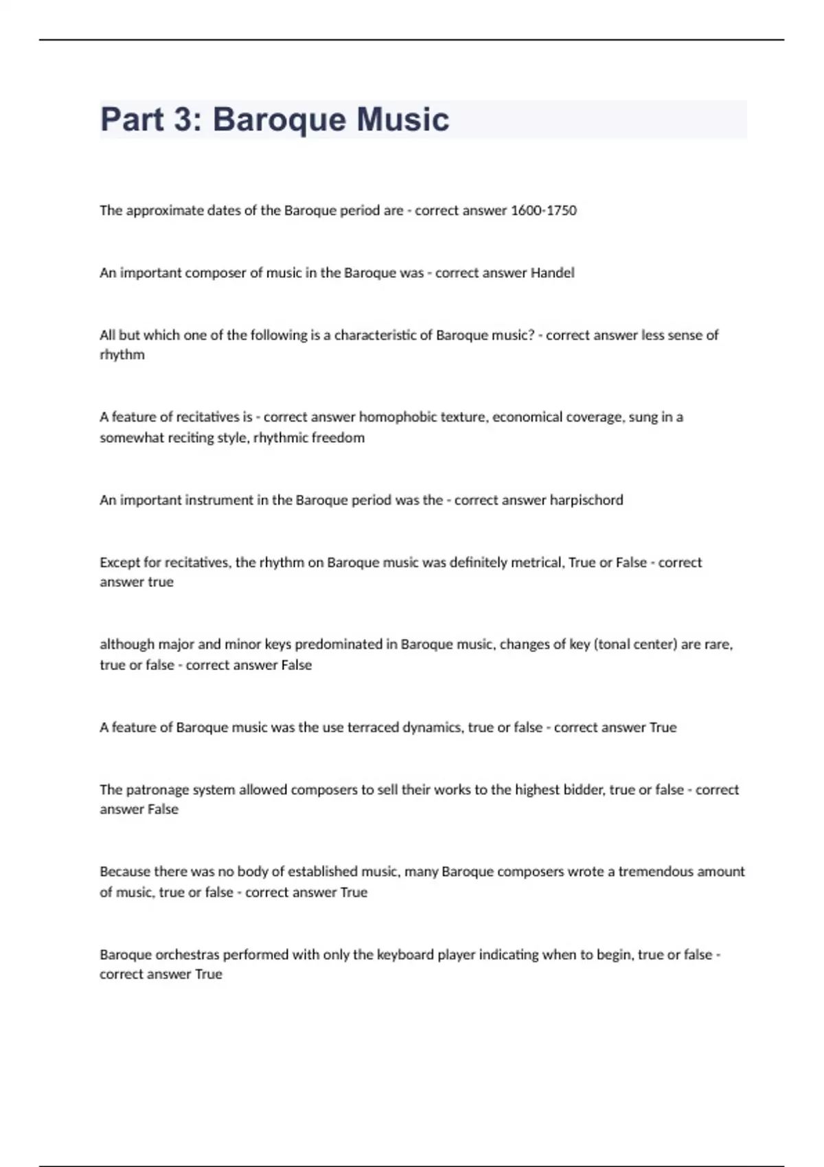 Part 3 Baroque MusicThe approximate dates of the Baroque period are - correct answer An important composer of music in the Baroque was - correct answer Handel All but which one of the following is a characteristic of Baroque music? - correct answer less sense of rhythm A feature of recitatives is - correct answer homophobic texture, economical coverage, sung in a somewhat reciting style, rhythmic freedom An important instrument in the Baroque period was the - correct answer harpischord Except for recitatives, the rhythm on Baroque music was definitely metrical, True or False - correct answer true although major and minor keys predominated in Baroque music, changes of key (tonal center) are rare, true or false - correct answer False A feature of Baroque music was the use terraced dynamics, true or false - correct answer True The patronage system allowed composers to sell their works to the highest bidder, true or false - correct answer False Because there was no body of established music, many Baroque composers wrote a tremendous amount of music, true or false - correct answer True Baroque orchestras performed with only the keyboard player indicating when to begin, true or false - correct answer True