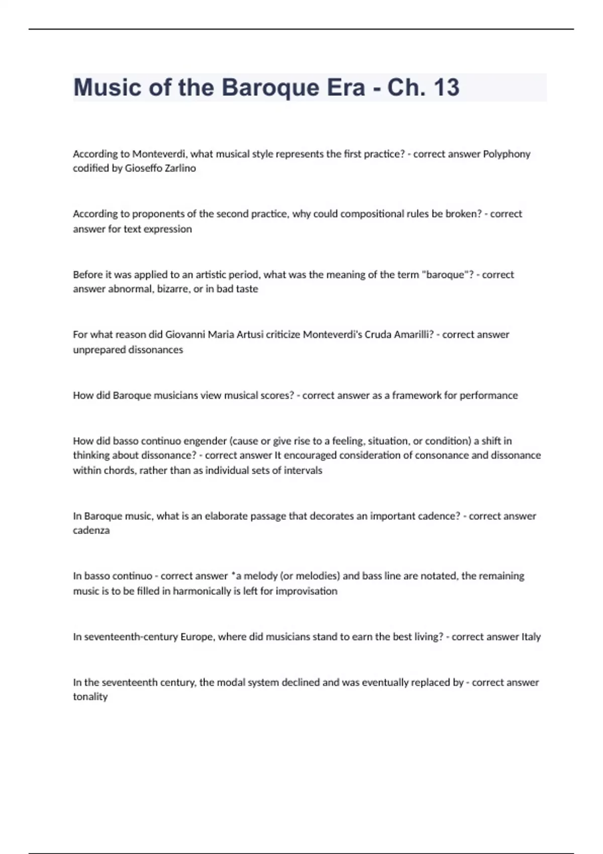 Music of the Baroque Era - Ch. 13 According to Monteverdi, what musical style represents the first practice? - correct answer Polyphony codified by Gioseffo Zarlino According to proponents of the second practice, why could compositional rules be broken? - correct answer for text expression Before it was applied to an artistic period, what was the meaning of the term "baroque"? - correct answer abnormal, bizarre, or in bad taste For what reason did Giovanni Maria Artusi criticize Monteverdi's Cruda Amarilli? - correct answer unprepared dissonances How did Baroque musicians view musical scores? - correct answer as a framework for performance How did basso continuo engender (cause or give rise to a feeling, situation, or condition) a shift in thinking about dissonance? - correct answer It encouraged consideration of consonance and dissonance within chords, rather than as individual sets of intervals In Baroque music, what is an elaborate passage that decorates an important cadence? - correct answer cadenza In basso continuo - correct answer *a melody (or melodies) and bass line are notated, the remaining music is to be filled in harmonically is left for improvisation In seventeenth-century Europe, where did musicians stand to earn the best living? - correct answer Italy In the seventeenth century, the modal system declined and was eventually replaced by - correct answer tonality