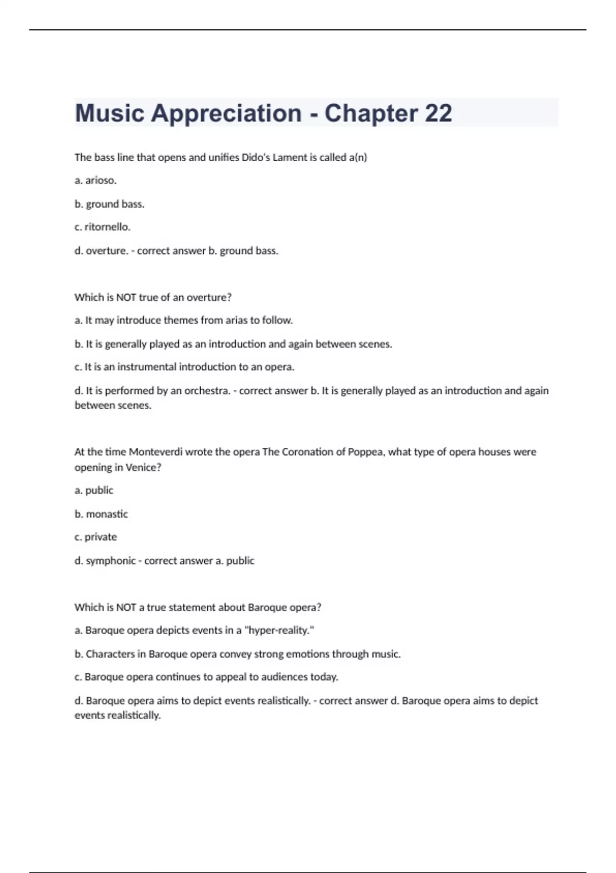Music Appreciation - Chapter 22The bass line that opens and unifies Dido's Lament is called a(n) a. arioso. b. ground bass. c. ritornello. d. overture. - correct answer b. ground bass. Which is NOT true of an overture? a. It may introduce themes from arias to follow. b. It is generally played as an introduction and again between scenes. c. It is an instrumental introduction to an opera. d. It is performed by an orchestra. - correct answer b. It is generally played as an introduction and again between scenes. At the time Monteverdi wrote the opera The Coronation of Poppea, what type of opera houses were opening in Venice? a. public b. monastic c. private d. symphonic - correct answer a. public Which is NOT a true statement about Baroque opera? a. Baroque opera depicts events in a "hyper-reality." b. Characters in Baroque opera convey strong emotions through music. c. Baroque opera continues to appeal to audiences today. d. Baroque opera aims to depict events realistically. - correct answer d. Baroque opera aims to depict events realistically. What is the musical style of the opening line "Thy hand, Belinda; darkness shades me"? a. recitative b. chorus c. overture d. aria - correct answer a. recitative The most important new genre of the Baroque era was a. opera. b. the Mass. c. the motet. d. the symphony. - correct answer a. opera. Why does Dido sing a lament at the end of Purcell's opera? a. Aeneas has left her. b. Aeneas discovered that Dido was actually his sister. c. Aeneas has been murdered. d. Aeneas was lost at sea. - correct answer a. Aeneas has left her. In the aria, Dido sings "Remember me, but ah! forget my fate." What was her fate? a. to leave her country b. to join a convent c. to die d. to marry Aeneas - correct answer c. to die The principal components of opera include arias, recitatives, overtures, and a. organum. b. chant. c. cantatas. d. choruses - correct answer d. choruses