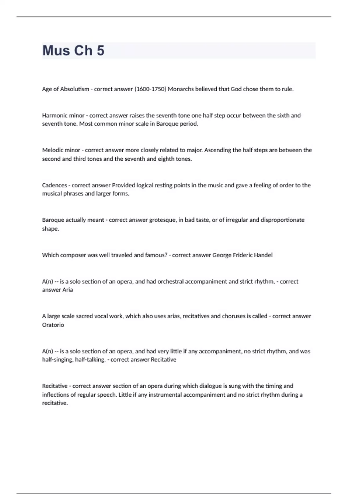 Mus Ch 5Age of Absolutism - correct answer () Monarchs believed that God chose them to rule. Harmonic minor - correct answer raises the seventh tone one half step occur between the sixth and seventh tone. Most common minor scale in Baroque period. Melodic minor - correct answer more closely related to major. Ascending the half steps are between the second and third tones and the seventh and eighth tones. Cadences - correct answer Provided logical resting points in the music and gave a feeling of order to the musical phrases and larger forms. Baroque actually meant - correct answer grotesque, in bad taste, or of irregular and disproportionate shape. Which composer was well traveled and famous? - correct answer George Frideric Handel A(n) -- is a solo section of an opera, and had orchestral accompaniment and strict rhythm. - correct answer Aria A large scale sacred vocal work, which also uses arias, recitatives and choruses is called - correct answer Oratorio A(n) -- is a solo section of an opera, and had very little if any accompaniment, no strict rhythm, and was half-singing, half-talking. - correct answer Recitative Recitative - correct answer section of an opera during which dialogue is sung with the timing and inflections of regular speech. Little if any instrumental accompaniment and no strict rhythm during a recitative.