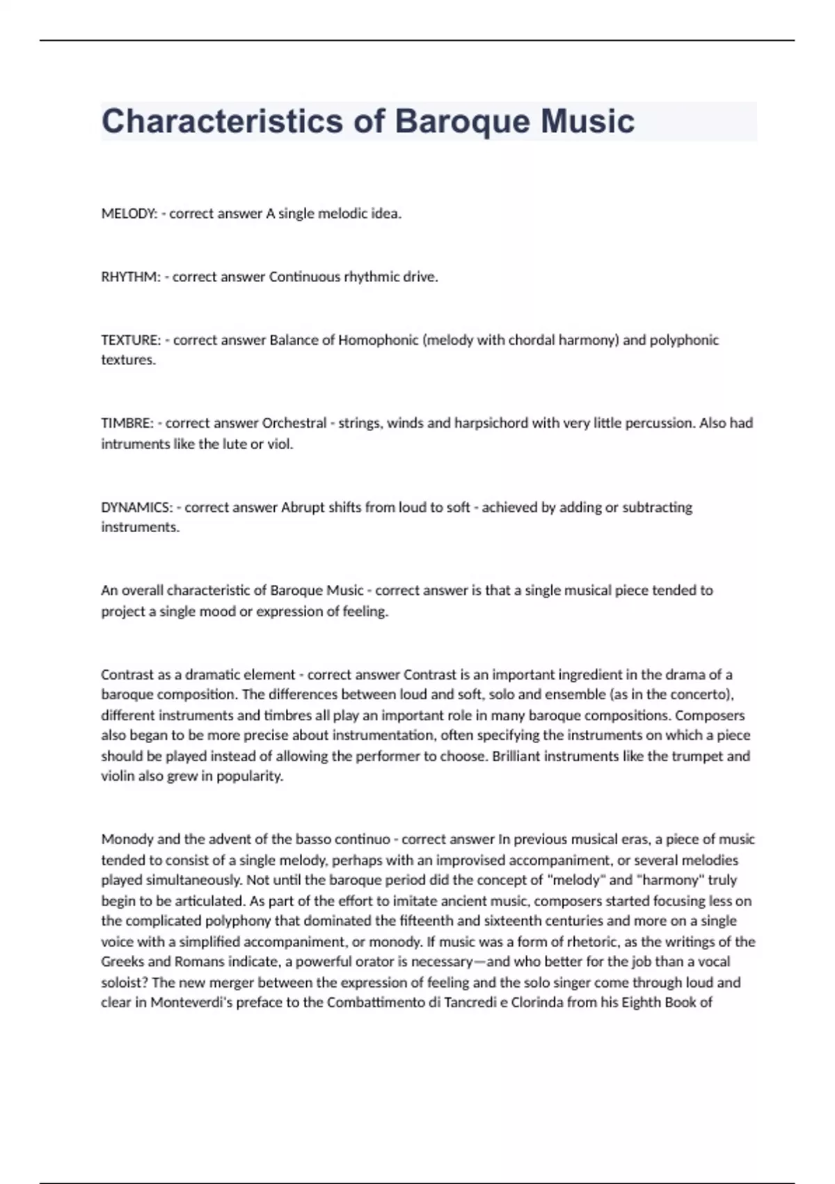 Characteristics of Baroque MusicMELODY: - correct answer A single melodic idea. RHYTHM: - correct answer Continuous rhythmic drive. TEXTURE: - correct answer Balance of Homophonic (melody with chordal harmony) and polyphonic textures. TIMBRE: - correct answer Orchestral - strings, winds and harpsichord with very little percussion. Also had intruments like the lute or viol. DYNAMICS: - correct answer Abrupt shifts from loud to soft - achieved by adding or subtracting instruments. An overall characteristic of Baroque Music - correct answer is that a single musical piece tended to project a single mood or expression of feeling. Contrast as a dramatic element - correct answer Contrast is an important ingredient in the drama of a baroque composition. The differences between loud and soft, solo and ensemble (as in the concerto), different instruments and timbres all play an important role in many baroque compositions. Composers also began to be more precise about instrumentation, often specifying the instruments on which a piece should be played instead of allowing the performer to choose. Brilliant instruments like the trumpet and violin also grew in popularity. Monody and the advent of the basso continuo - correct answer In previous musical eras, a piece of music tended to consist of a single melody, perhaps with an improvised accompaniment, or several melodies played simultaneously. Not until the baroque period did the concept of "melody" and "harmony" truly begin to be articulated. As part of the effort to imitate ancient music, composers started focusing less on the complicated polyphony that dominated the fifteenth and sixteenth centuries and more on a single voice with a simplified accompaniment, or monody. If music was a form of rhetoric, as the writings of the Greeks and Romans indicate, a powerful orator is necessary—and who better for the job than a vocal soloist? The new merger between the expression of feeling and the solo singer come through loud and clear in Monteverdi's preface to the Combattimento di Tancredi e Clorinda from his Eighth Book of Madrigals (1638), in which he writes: "It has seemed to me that the chief passions or affections of our mind are three in number, namely anger, equanimity and humility. The best philosophers agree, and the very nature of our voice, with its high, low and middle ranges, would indicate as much." The earliest operas are an excellent illustration of this new aesthetic. Along with the emphasis on a single melody and bass line came the practice of basso continuo, - correct answer a method of musical notation in which the melody and bass line are written out and the harmonic filler indicated in a type of shorthand. As the Italian musician Agostino Agazzari explained in 1607: Since the true style of expressing the words has at last been found, namely, by reproducing their sense in the best manner possible, which succeeds best with a single voice (or no more than a few), as in the modern airs by various able men, and as is the constant practice at Rome in concerted music, I say that it is not necessary to make a score... A Bass, with its signs for the harmonies, is enough. But if some one were to tell me that, for playing the old works, full of fugue and counterpoints, a Bass is not enough, my answer is that vocal works of this kind are no longer in use. Because basso continuo, or thorough bass, - correct answer remained standard practice until the end of the baroque period, the era is sometimes known as the "age of the thorough bass." Different instrumental sounds - correct answer After being ignored for decades, baroque music has become increasingly popular over the last fifty years. As part of this new interest, scholars and musicians have spent countless hours trying to figure out how the music might have sounded to 17th and 18th century audiences. While we will never be able to recreate a performance precisely, their work has unearthed several major differences between baroque and modern ensembles: