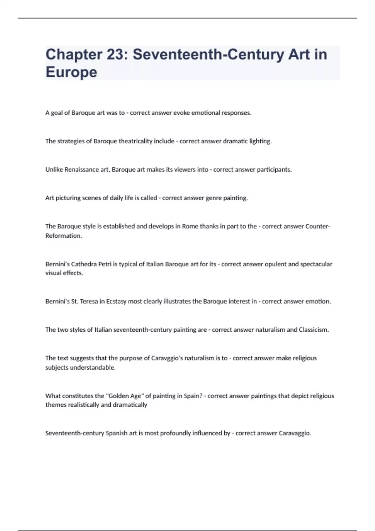 Chapter 23 Seventeenth-Century Art in EuropeA goal of Baroque art was to - correct answer evoke emotional responses. The strategies of Baroque theatricality include - correct answer dramatic lighting. Unlike Renaissance art, Baroque art makes its viewers into - correct answer participants. Art picturing scenes of daily life is called - correct answer genre painting. The Baroque style is established and develops in Rome thanks in part to the - correct answer Counter-Reformation. Bernini's Cathedra Petri is typical of Italian Baroque art for its - correct answer opulent and spectacular visual effects. Bernini's St. Teresa in Ecstasy most clearly illustrates the Baroque interest in - correct answer emotion. The two styles of Italian seventeenth-century painting are - correct answer naturalism and Classicism. The text suggests that the purpose of Caravggio's naturalism is to - correct answer make religious subjects understandable. What constitutes the "Golden Age" of painting in Spain? - correct answer paintings that depict religious themes realistically and dramatically Seventeenth-century Spanish art is most profoundly influenced by - correct answer Caravaggio. Jusepe de Ribera's painting is best described as - correct answer Classical and naturalistic. What concern common in the Renaissance and Baroque eras is demonstrated in Velázquez's Las Meninas? - correct answer status of the artist What motivated the addition of a Baroque façade to the Romanesque cathedral of St. James in Santiago de Compostela in Spain? - correct answer renewed interest in pilgrimages to the shrines of saints What new developments in Flemish painting are evident in the workshop of Peter Paul Rubens? - correct answer Rubens hires specialist painters as shop assistants. What aspect of Ruben's painting reveals his familiarity with Italian art? - correct answer heroic bodies How do paintings by Peter Paul Rubens reveal his northern heritage? - correct answer surface description Which country's political history is pictured in Ruben's Henry IV Receiving the Portrait of Marie de' Medici? - correct answer France A breakfast piece is a still life featuring - correct answer bread and fruit. The predominant style of Dutch seventeenth-century art is - correct answer naturalistic. The subjects preferred in the Protestant Netherlands include - correct answer portraiture, genre, and landscapes. Which printmaking process is most closely associated with Rembrandt? - correct answer etching Vermeer used the camera obscura to - correct answer study the composition.