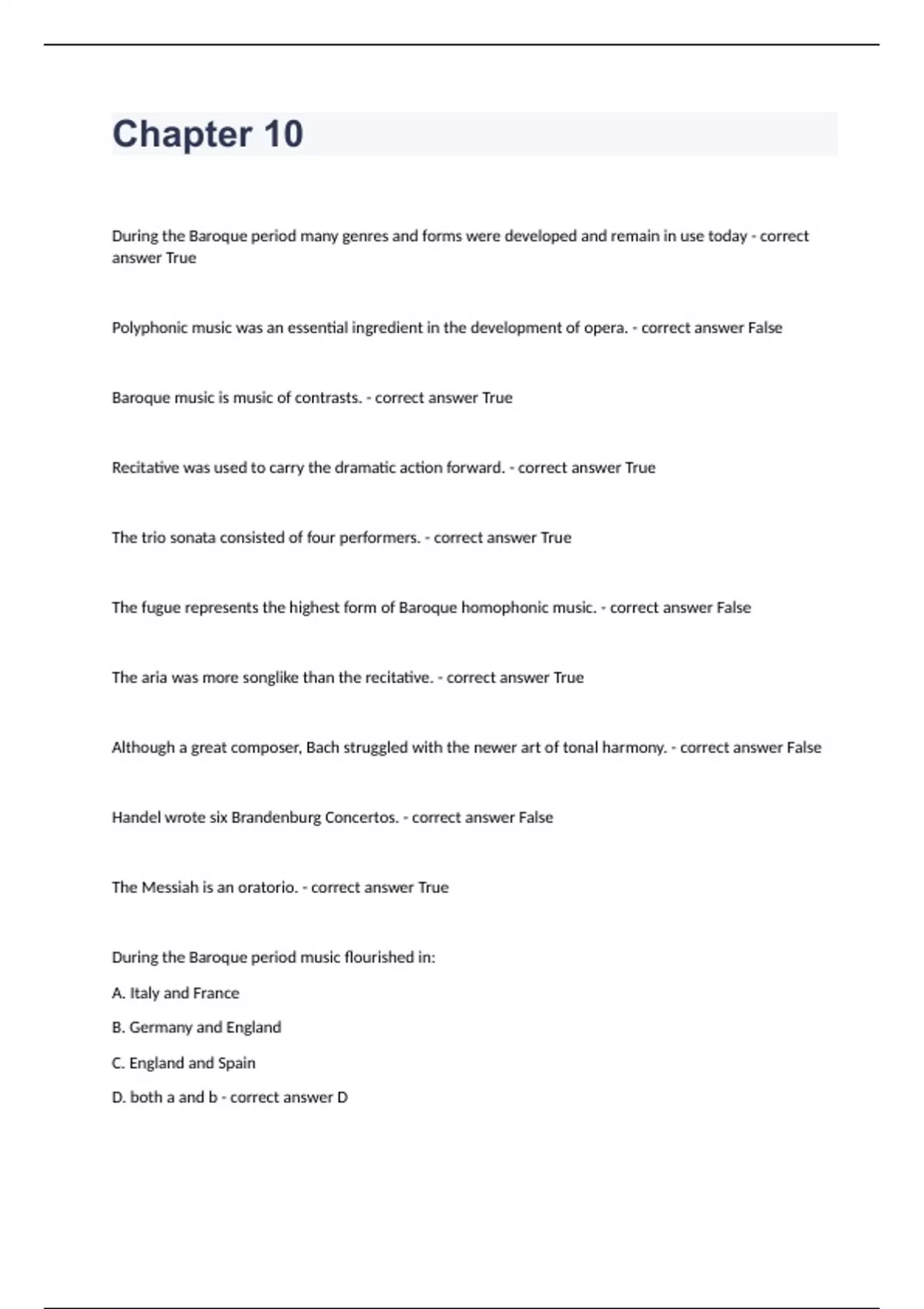 Chapter 10During the Baroque period many genres and forms were developed and remain in use today - correct answer True Polyphonic music was an essential ingredient in the development of opera. - correct answer False Baroque music is music of contrasts. - correct answer True Recitative was used to carry the dramatic action forward. - correct answer True The trio sonata consisted of four performers. - correct answer True The fugue represents the highest form of Baroque homophonic music. - correct answer False The aria was more songlike than the recitative. - correct answer True Although a great composer, Bach struggled with the newer art of tonal harmony. - correct answer False Handel wrote six Brandenburg Concertos. - correct answer False The Messiah is an oratorio. - correct answer True During the Baroque period music flourished in: A. Italy and France B. Germany and England C. England and Spain D. both a and b - correct answer D
