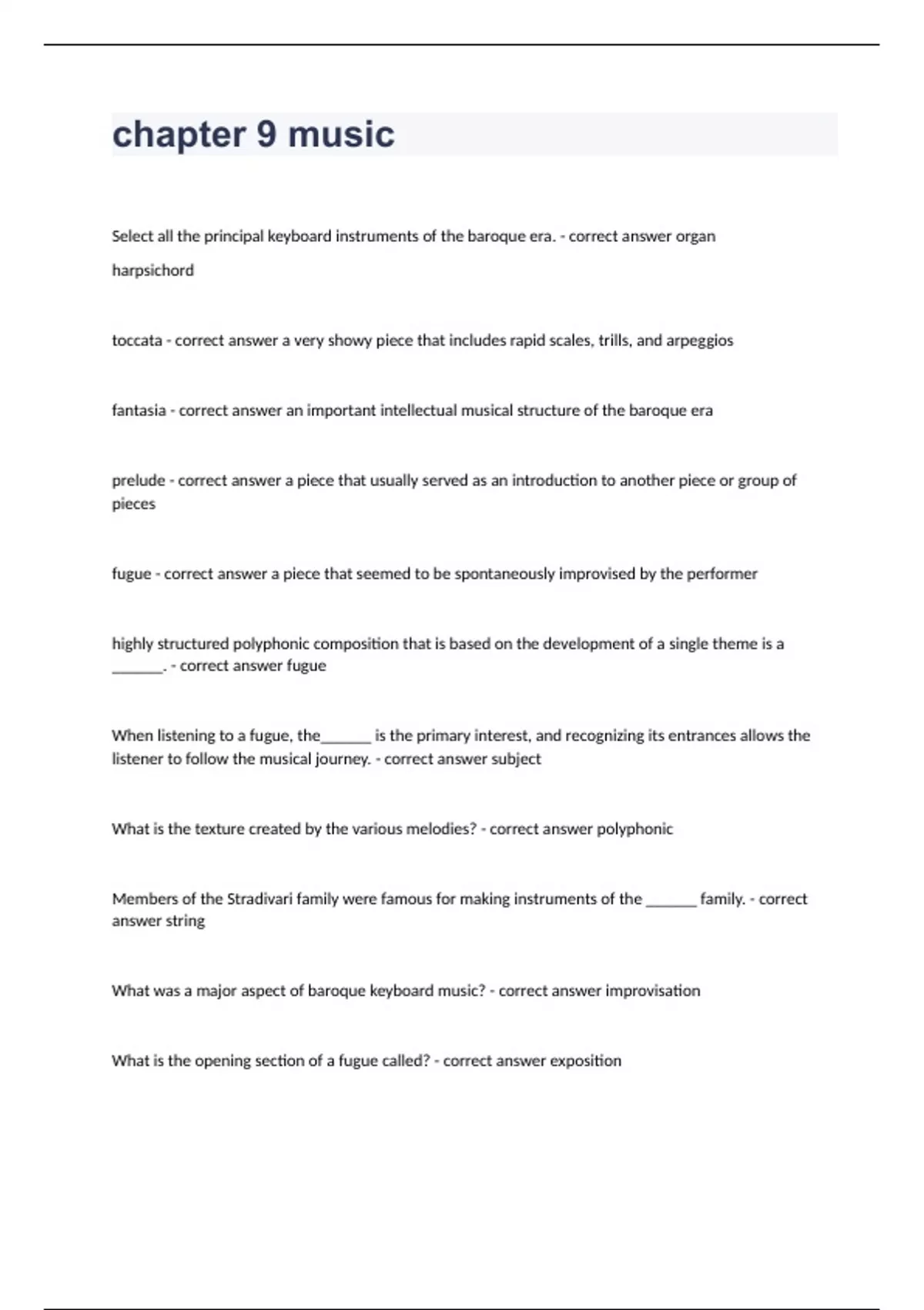chapter 9 music.Select all the principal keyboard instruments of the baroque era. - correct answer organ harpsichord toccata - correct answer a very showy piece that includes rapid scales, trills, and arpeggios fantasia - correct answer an important intellectual musical structure of the baroque era prelude - correct answer a piece that usually served as an introduction to another piece or group of pieces fugue - correct answer a piece that seemed to be spontaneously improvised by the performer highly structured polyphonic composition that is based on the development of a single theme is a ______. - correct answer fugue When listening to a fugue, the______ is the primary interest, and recognizing its entrances allows the listener to follow the musical journey. - correct answer subject What is the texture created by the various melodies? - correct answer polyphonic Members of the Stradivari family were famous for making instruments of the ______ family. - correct answer string What was a major aspect of baroque keyboard music? - correct answer improvisation What is the opening section of a fugue called? - correct answer exposition
