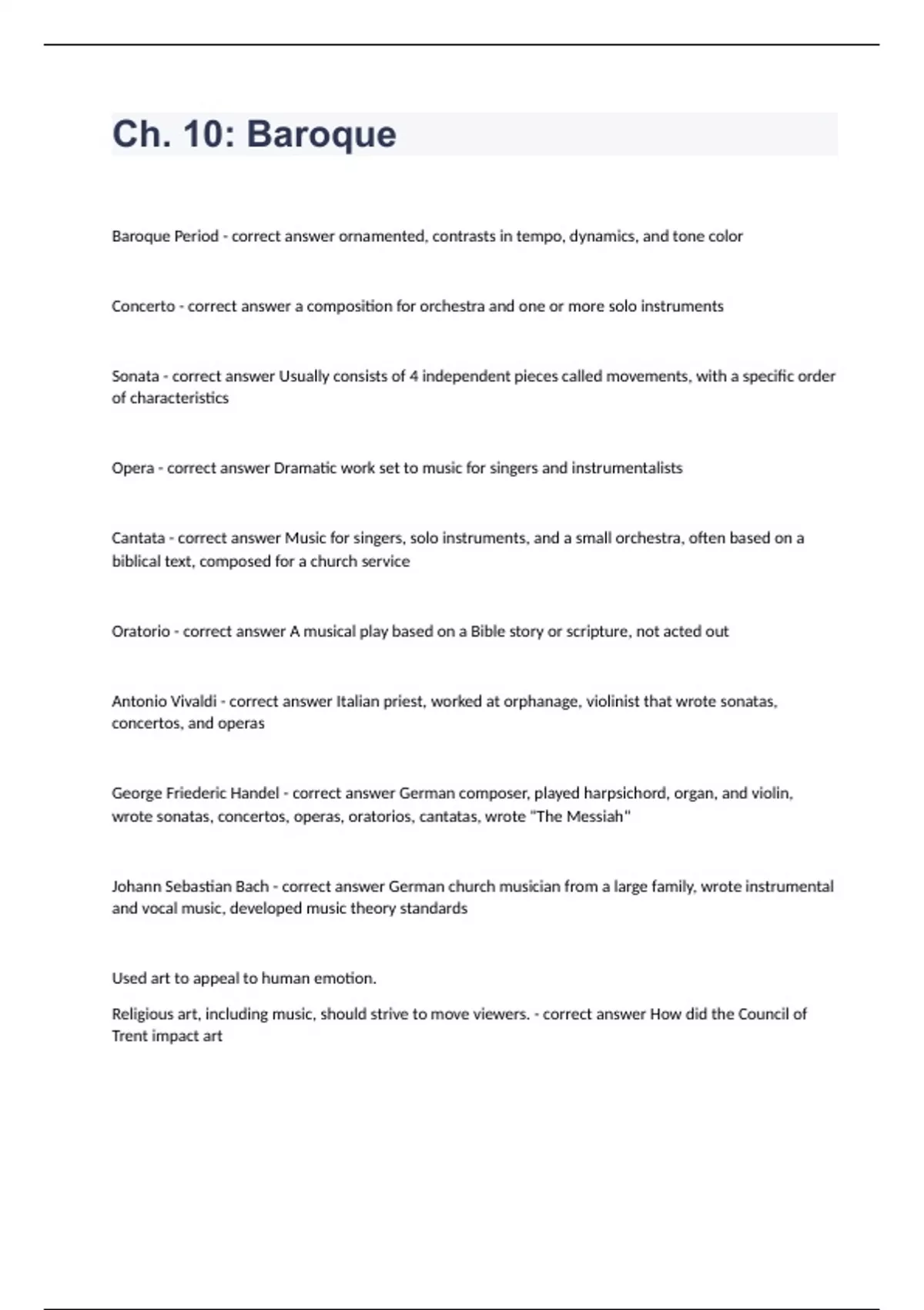 Ch. 10 BaroqueBaroque Period - correct answer ornamented, contrasts in tempo, dynamics, and tone color Concerto - correct answer a composition for orchestra and one or more solo instruments Sonata - correct answer Usually consists of 4 independent pieces called movements, with a specific order of characteristics Opera - correct answer Dramatic work set to music for singers and instrumentalists Cantata - correct answer Music for singers, solo instruments, and a small orchestra, often based on a biblical text, composed for a church service Oratorio - correct answer A musical play based on a Bible story or scripture, not acted out Antonio Vivaldi - correct answer Italian priest, worked at orphanage, violinist that wrote sonatas, concertos, and operas George Friederic Handel - correct answer German composer, played harpsichord, organ, and violin, wrote sonatas, concertos, operas, oratorios, cantatas, wrote "The Messiah" Johann Sebastian Bach - correct answer German church musician from a large family, wrote instrumental and vocal music, developed music theory standards Used art to appeal to human emotion. Religious art, including music, should strive to move viewers. - correct answer How did the Council of Trent impact art