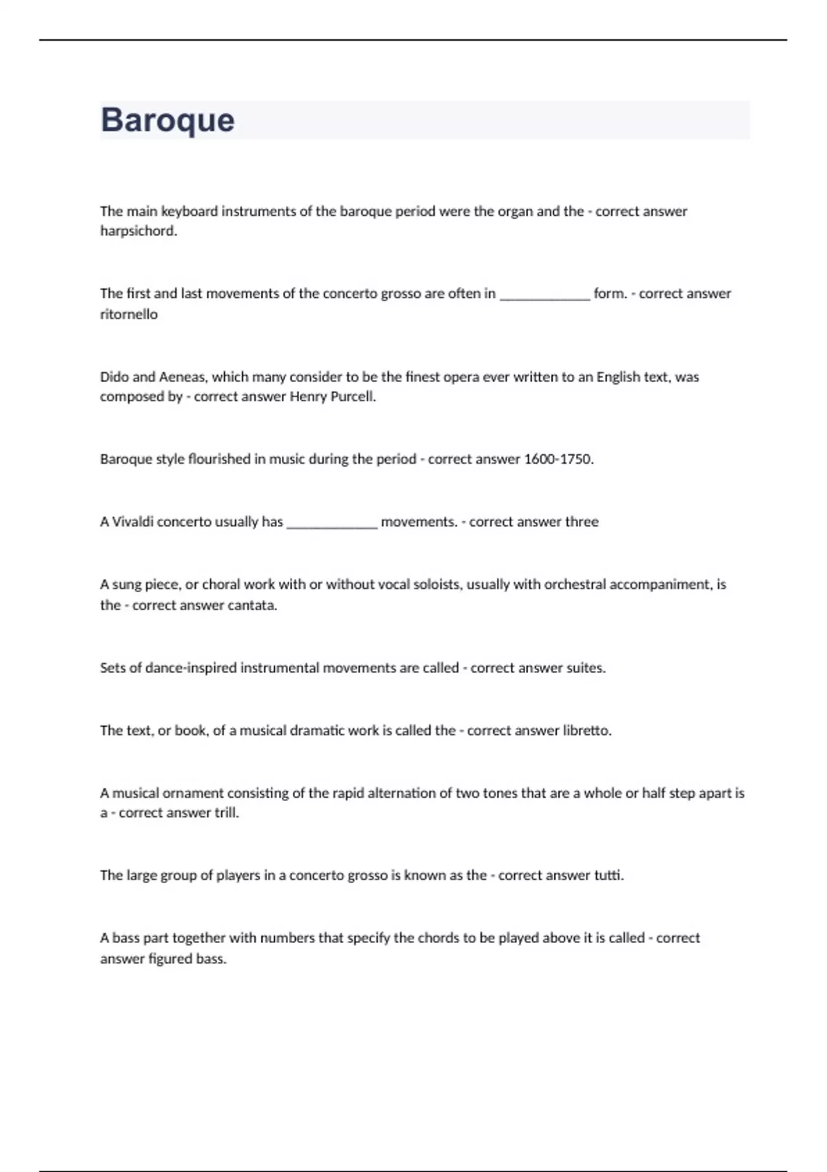 Baroque The main keyboard instruments of the baroque period were the organ and the - correct answer harpsichord. The first and last movements of the concerto grosso are often in ____________ form. - correct answer ritornello Dido and Aeneas, which many consider to be the finest opera ever written to an English text, was composed by - correct answer Henry Purcell. Baroque style flourished in music during the period - correct answer . A Vivaldi concerto usually has ____________ movements. - correct answer three A sung piece, or choral work with or without vocal soloists, usually with orchestral accompaniment, is the - correct answer cantata. Sets of dance-inspired instrumental movements are called - correct answer suites. The text, or book, of a musical dramatic work is called the - correct answer libretto. A musical ornament consisting of the rapid alternation of two tones that are a whole or half step apart is a - correct answer trill. The large group of players in a concerto grosso is known as the - correct answer tutti. A bass part together with numbers that specify the chords to be played above it is called - correct answer figured bass.