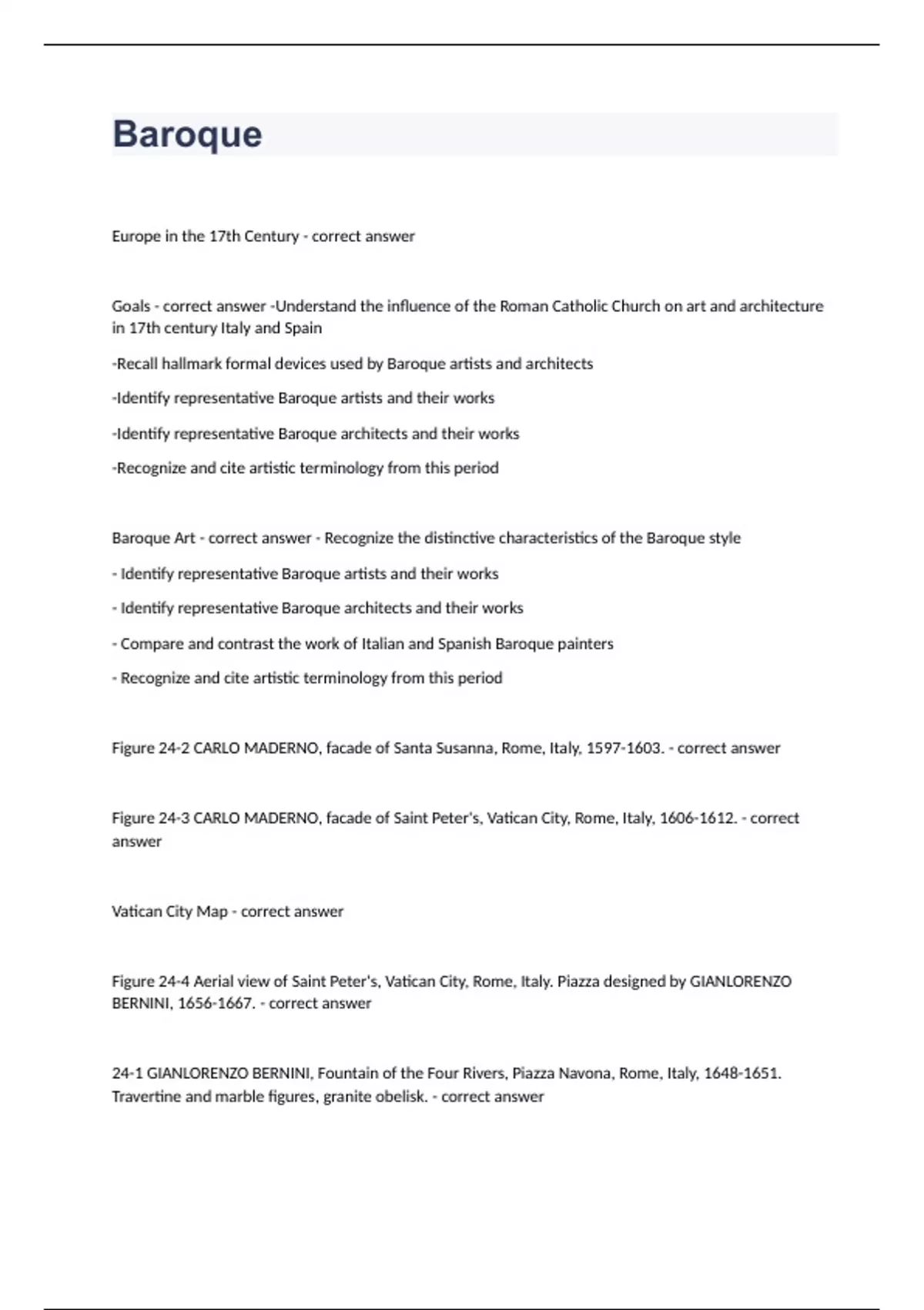 BaroqueEurope in the 17th Century - correct answer Goals - correct answer -Understand the influence of the Roman Catholic Church on art and architecture in 17th century Italy and Spain -Recall hallmark formal devices used by Baroque artists and architects -Identify representative Baroque artists and their works -Identify representative Baroque architects and their works -Recognize and cite artistic terminology from this period Baroque Art - correct answer - Recognize the distinctive characteristics of the Baroque style - Identify representative Baroque artists and their works - Identify representative Baroque architects and their works - Compare and contrast the work of Italian and Spanish Baroque painters - Recognize and cite artistic terminology from this period Figure 24-2 CARLO MADERNO, facade of Santa Susanna, Rome, Italy, . - correct answer Figure 24-3 CARLO MADERNO, facade of Saint Peter's, Vatican City, Rome, Italy, . - correct answer Vatican City Map - correct answer Figure 24-4 Aerial view of Saint Peter's, Vatican City, Rome, Italy. Piazza designed by GIANLORENZO BERNINI, . - correct answer 24-1 GIANLORENZO BERNINI, Fountain of the Four Rivers, Piazza Navona, Rome, Italy, . Travertine and marble figures, granite obelisk. - correct answer Figure 24-5 GIANLORENZO BERNINI, baldacchino, Saint Peter's, Vatican City, Rome, Italy, . Gilded bronze, 100' high. - correct answer Figure 24-6A GIANLORENZO BERNINI, Scala Regia (Royal Stairway), Vatican City, Rome, Italy, . - correct answer Figure 24-6 GIANLORENZO BERNINI, David, 1623. Marble, 5' 7" high. Galleria Borghese, Rome. - correct answer 24-6B GIANLORENZO BERNINI, Apollo and Daphne, . Marble, 8' high. Galleria Borghese, Rome. - correct answer Figure 24-8 GIANLORENZO BERNINI, inerior of the Cornaro Chapel, Santa Maria della vittoria, Rome, Italy, . - correct answer Figure 24-7 GIANLORENZO BERNINI, Ecstasy of Saint Teresa, Cornaro Chapel, Santa Maria della Vittoria, Rome, Italy, . Marble, height of group 11' 6". - correct answer Figure 24-9 FRANCESCO BORROMINI, facade of San Carlo alle Quattro Fontane, Rome, Italy, . - correct answer 24-9A GUARINO GUARINI, Palazzo Carignano, Turin, Italy, . - correct answer Figure 24-10 FRANCESCO BORROMINI, plan of San Carlo alle Quattro Fontane, Rome, Italy, . - correct answer Figure 24-11 FRANCESCO BORROMINI, San Carlo alle Quattro Fontane (view into dome), Rome, Italy, . - correct answer Figure 24-12 FRANCESCO BORROMINI, Chapel of Saint Ivo, College of the Sapienza, Rome, Italy, begun 1642. - correct answer Figure 24-13 FRANCESCO BORROMINI, plan of the Chapel of Saint Ivo, College of the Sapienza, Rome, Italy, begun 1642. - correct answer Figure 24-14 FRANCESCO BORROMINI, Chapel of Saint Ivo (view into dome), College of the Sapienza, Rome, Italy, begun 1642. - correct answer 24-14A GUARINO GUARINI, Interior of the dome of the Cappella della Santissima Sindone (Chapel of the Holy Shroud), Turin, Italy, . - correct answer Figure 24-15 ANNIBALE CARRACCI, Flight into Egypt, . Oil on canvas, 4' x 7' 6". Galleria Doria Pamphili, Rome. - correct answer Figure 24-16 ANNIBALE CARRACCI, Loves of the Gods, ceiling frescoes in the gallery, Palazzo Farnese, Rome, Italy, . - correct answer Figure 24-18 CARAVAGGIO, Conversion of Saint Paul, ca. 1601. Oil on canvas, 7' 6" x 5' 9". Cerasi Chapel, Santa Maria del Popolo, Rome. - correct answer Figure 24-17 CARAVAGGIO, Calling of Saint Matthew, ca. . Oil on canvas, 11' 1" x 11' 5". Contarelli Chapel, San Luigi dei Francesi, Rome - correct answer 24-17A CARAVAGGIO, Musicians, ca. 1595. Oil on canvas, 3' 1/4" X 3' 10 5/8". Metropolitan Museum of Art, New York (Rogers Fund, 1952). - correct answer Figure 24-18A CARAVAGGIO, Entombment, from the chapel of Pietro Vittrice, Santa Maria in Vallicella, Rome, Italy, ca. 1603. Oil on canvas, 9' 10 1/8" x 6' 7 15/16". Musei Vaticani, Rome. - correct answer Figure 24-19 ARTEMISIA GENTILESCHI, Judith Slaying Holofernes, ca. . Oil on canvas, 6' 6 1/3" x 5' 4". Galleria degli Uffizi, Florence. - correct answer 24-20 ARTEMISIA GENTILESCHI, Self-Portrait as the Allegory of Painting, ca. . Oil on canvas, 3' 2 7/8" X 2' 5 5/8". Royal Collection, Kensington Palace, London. - correct answer