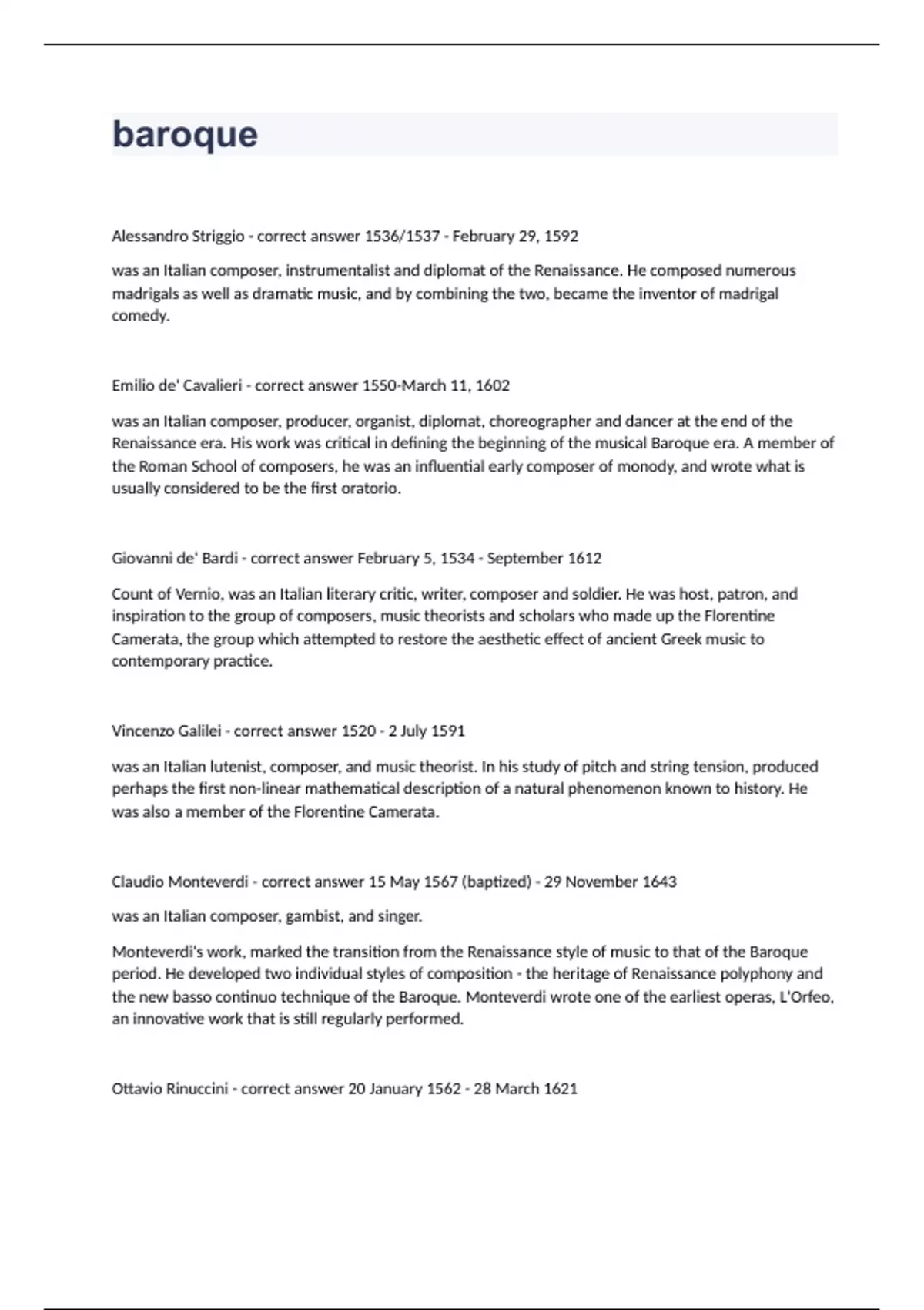 baroqueAlessandro Striggio - correct answer 1536/1537 - February 29, 1592 was an Italian composer, instrumentalist and diplomat of the Renaissance. He composed numerous madrigals as well as dramatic music, and by combining the two, became the inventor of madrigal comedy. Emilio de' Cavalieri - correct answer 1550-March 11, 1602 was an Italian composer, producer, organist, diplomat, choreographer and dancer at the end of the Renaissance era. His work was critical in defining the beginning of the musical Baroque era. A member of the Roman School of composers, he was an influential early composer of monody, and wrote what is usually considered to be the first oratorio. Giovanni de' Bardi - correct answer February 5, 1534 - September 1612 Count of Vernio, was an Italian literary critic, writer, composer and soldier. He was host, patron, and inspiration to the group of composers, music theorists and scholars who made up the Florentine Camerata, the group which attempted to restore the aesthetic effect of ancient Greek music to contemporary practice. Vincenzo Galilei - correct answer 1520 - 2 July 1591 was an Italian lutenist, composer, and music theorist. In his study of pitch and string tension, produced perhaps the first non-linear mathematical description of a natural phenomenon known to history. He was also a member of the Florentine Camerata. Claudio Monteverdi - correct answer 15 May 1567 (baptized) - 29 November 1643 was an Italian composer, gambist, and singer. Monteverdi's work, marked the transition from the Renaissance style of music to that of the Baroque period. He developed two individual styles of composition - the heritage of Renaissance polyphony and the new basso continuo technique of the Baroque. Monteverdi wrote one of the earliest operas, L'Orfeo, an innovative work that is still regularly performed. Ottavio Rinuccini - correct answer 20 January 1562 - 28 March 1621 was an Italian poet, courtier, and opera librettist at the end of the Renaissance and beginning of the Baroque eras. In collaborating with Jacopo Peri to produce the first opera, Dafne, in 1597, he became the first opera librettist. Jacopo Peri - correct answer 20 August 1561 - 12 August 1633 was an Italian composer and singer. He is often called the inventor of opera. He wrote the first work to be called an opera today, Dafne (around 1597), and also the first opera to have survived to the present day, Euridice (1600). Giulio Caccini - correct answer 8 October 1551 - 10 December 1618 was an Italian composer, teacher, singer, instrumentalist and writer. He was one of the founders of the genre of opera, and one of the single most influential creators of the new Baroque style. Credited with the composition of the first surviving opera, Euridice (1600) Giacomo Carissimi - correct answer baptized April 18, 1605 - January 12, 1674 was an Italian composer who is best know for his oratorios. He composed Jepthe Heinrich Schütz - correct answer October 8, 1585 - November 6, 1672 was a German composer and organist. He wrote what is thought to be the first German opera, Dafne, performed at Torgau in 1627, of which the music has since been lost. Girolamo Frescobaldi - correct answer September, 1583 - March 1, 1643 was a musician from Ferrara, one of the most important composers of keyboard music in the late Renaissance and early Baroque periods. Was appointed organist of St. Peter's Basilica from July 21, 1608 until 1628 and again from 1634 until his death. Alessandro Scarlatti - correct answer 2 May 1660 - 24 October 1725 was an Italian Baroque composer especially famous for his operas and chamber cantatas. He is considered the founder of the Neapolitan school of opera. Jean-Baptiste Lully - correct answer 28 November 1632 - 22 March 1687