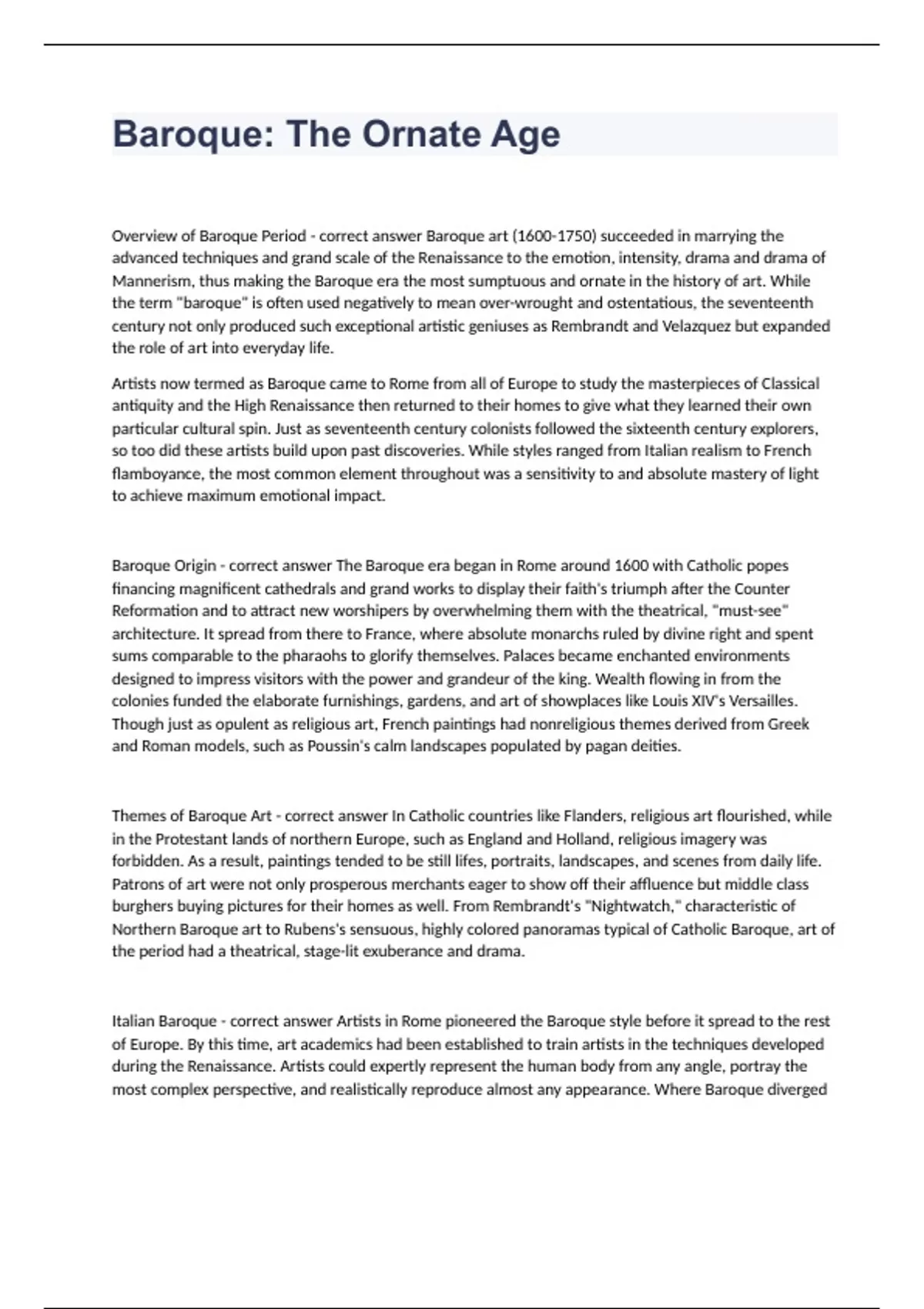 Baroque The Ornate AgeOverview of Baroque Period - correct answer Baroque art () succeeded in marrying the advanced techniques and grand scale of the Renaissance to the emotion, intensity, drama and drama of Mannerism, thus making the Baroque era the most sumptuous and ornate in the history of art. While the term "baroque" is often used negatively to mean over-wrought and ostentatious, the seventeenth century not only produced such exceptional artistic geniuses as Rembrandt and Velazquez but expanded the role of art into everyday life. Artists now termed as Baroque came to Rome from all of Europe to study the masterpieces of Classical antiquity and the High Renaissance then returned to their homes to give what they learned their own particular cultural spin. Just as seventeenth century colonists followed the sixteenth century explorers, so too did these artists build upon past discoveries. While styles ranged from Italian realism to French flamboyance, the most common element throughout was a sensitivity to and absolute mastery of light to achieve maximum emotional impact. Baroque Origin - correct answer The Baroque era began in Rome around 1600 with Catholic popes financing magnificent cathedrals and grand works to display their faith's triumph after the Counter Reformation and to attract new worshipers by overwhelming them with the theatrical, "must-see" architecture. It spread from there to France, where absolute monarchs ruled by divine right and spent sums comparable to the pharaohs to glorify themselves. Palaces became enchanted environments designed to impress visitors with the power and grandeur of the king. Wealth flowing in from the colonies funded the elaborate furnishings, gardens, and art of showplaces like Louis XIV's Versailles. Though just as opulent as religious art, French paintings had nonreligious themes derived from Greek and Roman models, such as Poussin's calm landscapes populated by pagan deities. Themes of Baroque Art - correct answer In Catholic countries like Flanders, religious art flourished, while in the Protestant lands of northern Europe, such as England and Holland, religious imagery was forbidden. As a result, paintings tended to be still lifes, portraits, landscapes, and scenes from daily life. Patrons of art were not only prosperous merchants eager to show off their affluence but middle class burghers buying pictures for their homes as well. From Rembrandt's "Nightwatch," characteristic of Northern Baroque art to Rubens's sensuous, highly colored panoramas typical of Catholic Baroque, art of the period had a theatrical, stage-lit exuberance and drama. Italian Baroque - correct answer Artists in Rome pioneered the Baroque style before it spread to the rest of Europe. By this time, art academics had been established to train artists in the techniques developed during the Renaissance. Artists could expertly represent the human body from any angle, portray the most complex perspective, and realistically reproduce almost any appearance. Where Baroque diverged from Renaissance was the emphasis on emotion rather than rationality, dynamism rather than stasis. It was as if Baroque artists took Renaissance figures and set them spinning like tops. Three artists in different media best represent the pinnacle of Italian Baroque: the painter Caravaggio, the sculptor Bernini and the architect Borromini. Caravaggio: The Supernatural Made Real - correct answer The most original painter of the seventeenth century, Caravaggio () injected new life into Italian painting after the sterile artificiality of Mannerism. He took realism to new lengths, painting bodies in a thoroughly "down and dirty" style, as opposed to pale, Mannerist phantoms. In doing so, Caravaggio secularized religious rt, making saints and miracles seemed like ordinary people and everyday events. Although specializing in large religious works, Caravagiio advocated "direct painting" from nature - often, it seemed, directly from the seamy slums. In "The Calling of St. Matthew," for example, the apostle-to-be sits in a dark pub, surrounded by dandies counting money, when Christ orders him, Follow Me. A strong diagonal beam of light illuminates the thunderstruck tax-collector's expression and gesture of astonishment. In "Supper at Emmaus," Caravaggio showed the moment the apostles realized their table companion wast he resurrected Christ as an encounter in a wineshop. The disciples, pushing back chairs and throwing open their arms and a bowl of wormy fruit about to topple off the table make the action leap out of the picture frame, enveloping the viewer in the drama. "The Conversion of St. Paul" demonstrated Caravaggio's ability to see afresh a traditional subject. Other painters depicted the Pharisee Saul converted by a voice from heaven with Christ on the heavenly throne surrounded by throngs of angels. Caravaggio showed St. Paul flat on his back, fallen from his horse, which is portrayed in an explicit rear-end view. The hard focus and blinding spotlight reveal details like veins on the attendant's legs and rivets on Saul's armor, while inessential elements disappear in the dark background. Caravaggio's Painting Technique - correct answer Caravaggio's use of perspective brings the viewer into the action, and chiaroscuro engages the emotions while intensifying the scene's impact through dramatic light and dark contrasts. This untraditional, theatrical staging focuses a harsh light from a single source on the subject in the foreground to concentrate the viewer's attention on the power of the event and the subject's response. Because of the shadowy background Caravaggio favored, his style was called "il tenebroso" (in a "dark manner"). Many of Caravaggio's patrons who commissioned altarpieces refused to accept his renditions, considering them vulgar or profane. However, Caravaggio's choice of disreputable, lower-class folk as suitable subjects for religious art expressed the Counter Reformation belief that fa
