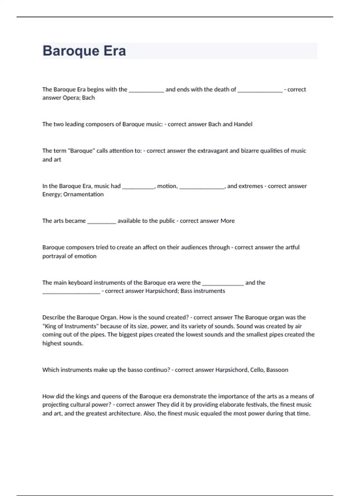 Baroque EraThe Baroque Era begins with the ___________ and ends with the death of ______________ - correct answer Opera; Bach The two leading composers of Baroque music: - correct answer Bach and Handel The term "Baroque" calls attention to: - correct answer the extravagant and bizarre qualities of music and art In the Baroque Era, music had __________, motion, ______________, and extremes - correct answer Energy; Ornamentation The arts became _________ available to the public - correct answer More Baroque composers tried to create an affect on their audiences through - correct answer the artful portrayal of emotion The main keyboard instruments of the Baroque era were the _____________ and the __________________ - correct answer Harpsichord; Bass instruments Describe the Baroque Organ. How is the sound created? - correct answer The Baroque organ was the "King of Instruments" because of its size, power, and its variety of sounds. Sound was created by air coming out of the pipes. The biggest pipes created the lowest sounds and the smallest pipes created the highest sounds. Which instruments make up the basso continuo? - correct answer Harpsichord, Cello, Bassoon How did the kings and queens of the Baroque era demonstrate the importance of the arts as a means of projecting cultural power? - correct answer They did it by providing elaborate festivals, the finest music and art, and the greatest architecture. Also, the finest music equaled the most power during that time. Opera is ________ from beginning to end and based upon ___________ texts - correct answer Sung; Mythical The earliest operas were performed at the _________ of the nobility and royalty - correct answer Courts Why are there few early operas in English? - correct answer There are only a few early operas in English because operas were mostly sung in Italian, French and German. They also began on the Italian Peninsula and they had to be in their vernacular. A librettist writes the __________ of the opera, called the _____________ - correct answer Text; "Little Book" The composer writes the _________ for an opera - correct answer Music The role of the chorus in an opera is to ____________________ - correct answer Comment on the action The purely instrumental piece that begins an opera is called an _________________ - correct answer overture An opera aria is a song for __________________ with ______________ accompaniment - correct answer A soloist; orchestral Recitative is a style of singing that is similar to ______________ - correct answer Speech The texture of recitative is _______________ - correct answer Homophonic Castrati possessed the high range of a ________________ voice and physical power of a ________ voice - correct answer Woman; Man Castrati often came from ________________ households where families had given consent, in hopes that their sons would be among the ________ paid performers of the day - correct answer Poor; High