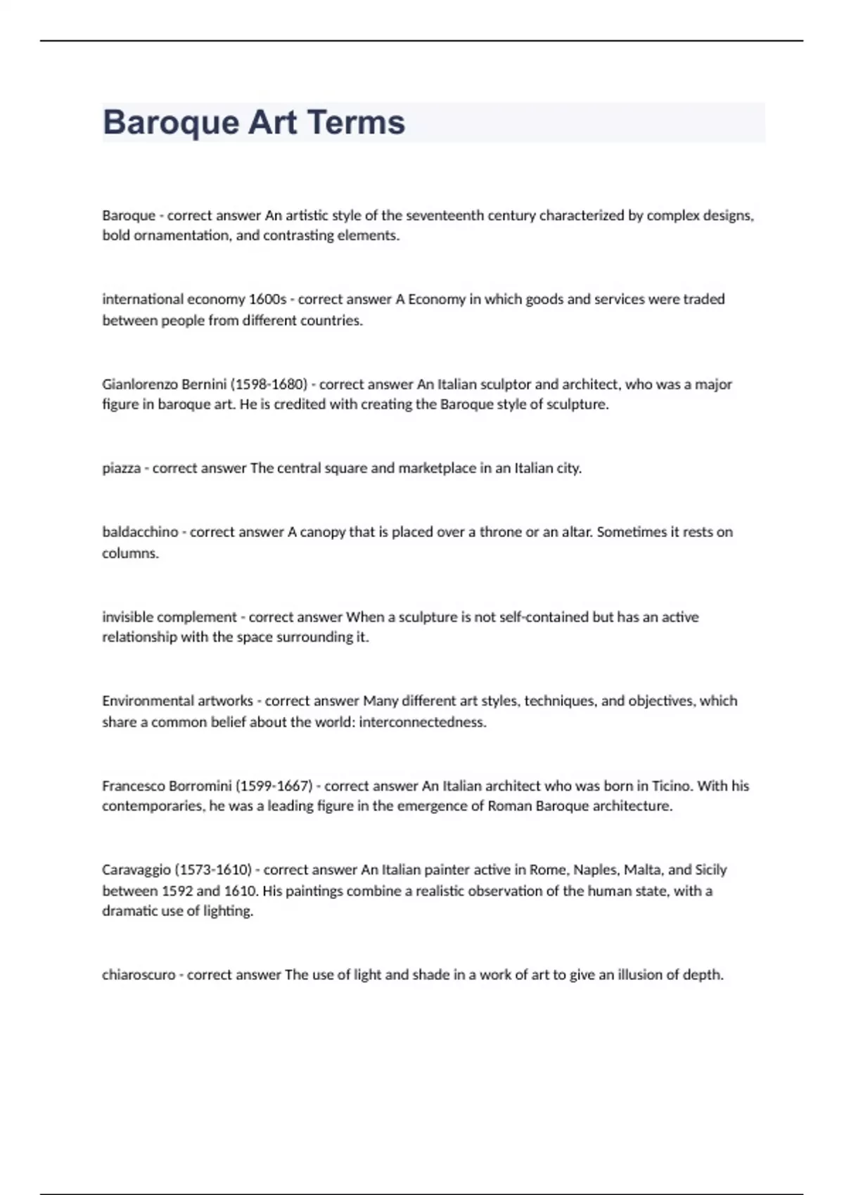 Baroque Art Terms Baroque - correct answer An artistic style of the seventeenth century characterized by complex designs, bold ornamentation, and contrasting elements. international economy 1600s - correct answer A Economy in which goods and services were traded between people from different countries. Gianlorenzo Bernini () - correct answer An Italian sculptor and architect, who was a major figure in baroque art. He is credited with creating the Baroque style of sculpture. piazza - correct answer The central square and marketplace in an Italian city. baldacchino - correct answer A canopy that is placed over a throne or an altar. Sometimes it rests on columns. invisible complement - correct answer When a sculpture is not self-contained but has an active relationship with the space surrounding it. Environmental artworks - correct answer Many different art styles, techniques, and objectives, which share a common belief about the world: interconnectedness. Francesco Borromini () - correct answer An Italian architect who was born in Ticino. With his contemporaries, he was a leading figure in the emergence of Roman Baroque architecture. Caravaggio () - correct answer An Italian painter active in Rome, Naples, Malta, and Sicily between 1592 and 1610. His paintings combine a realistic observation of the human state, with a dramatic use of lighting. chiaroscuro - correct answer The use of light and shade in a work of art to give an illusion of depth. tenebrism - correct answer The use of strong chiaroscuro and artificially illuminated areas to create a dramatic contrast of light and dark in a painting. Artemisia Gentileschi (c. ) - correct answer An Italian Baroque painter, who is considered one of the most accomplished painters of her generation. She was the first woman to become a member of the Accademia di Arte del Disegno in Florence. quadro riportato - correct answer A ceiling design in which painted scenes are arranged in panels that resemble framed pictures. illusionism - correct answer The representation of three-dimensions on a two-dimensional surface. trompe l-oeil - correct answer "To trick the eye." An illusion of three-dimensionality created with paint. Francisco de Zubarán () - correct answer A Spanish painter known for his religious paintings and for his still-lifes. He was also known for his forceful, realistic use of chiaroscuro. Diego Velazquez () - correct answer One of the most important painters of the Spanish Golden Age. He was an individualistic, portrait artist. He illustrated scenes of historical and cultural significance, as well as portraits of notable European figures and commoners. genre scene - correct answer A pictorial representation of scenes or events from ordinary, everyday life. Order of Santiago - correct answer A Christian military-religious order of knights founded for the purpose of fighting Spanish Muslims and of protecting pilgrims on their way to the shrine of Santiago de Compostela. Netherlands - correct answer A small country located along the North Sea in northwestern Europe. It was ruled by Spain until 1581.