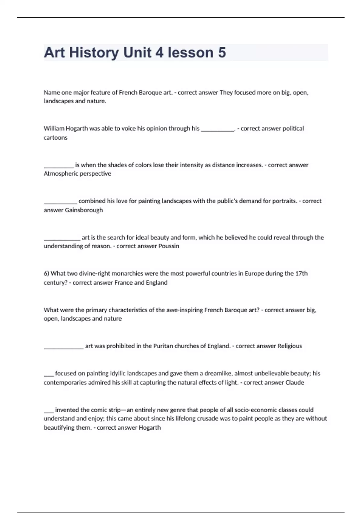 Art History Unit 4 lesson 5Name one major feature of French Baroque art. - correct answer They focused more on big, open, landscapes and nature. William Hogarth was able to voice his opinion through his __________. - correct answer political cartoons _________ is when the shades of colors lose their intensity as distance increases. - correct answer Atmospheric perspective __________ combined his love for painting landscapes with the public's demand for portraits. - correct answer Gainsborough ___________ art is the search for ideal beauty and form, which he believed he could reveal through the understanding of reason. - correct answer Poussin 6) What two divine-right monarchies were the most powerful countries in Europe during the 17th century? - correct answer France and England What were the primary characteristics of the awe-inspiring French Baroque art? - correct answer big, open, landscapes and nature ____________ art was prohibited in the Puritan churches of England. - correct answer Religious ___ focused on painting idyllic landscapes and gave them a dreamlike, almost unbelievable beauty; his contemporaries admired his skill at capturing the natural effects of light. - correct answer Claude ___ invented the comic strip—an entirely new genre that people of all socio-economic classes could understand and enjoy; this came about since his lifelong crusade was to paint people as they are without beautifying them. - correct answer Hogarth