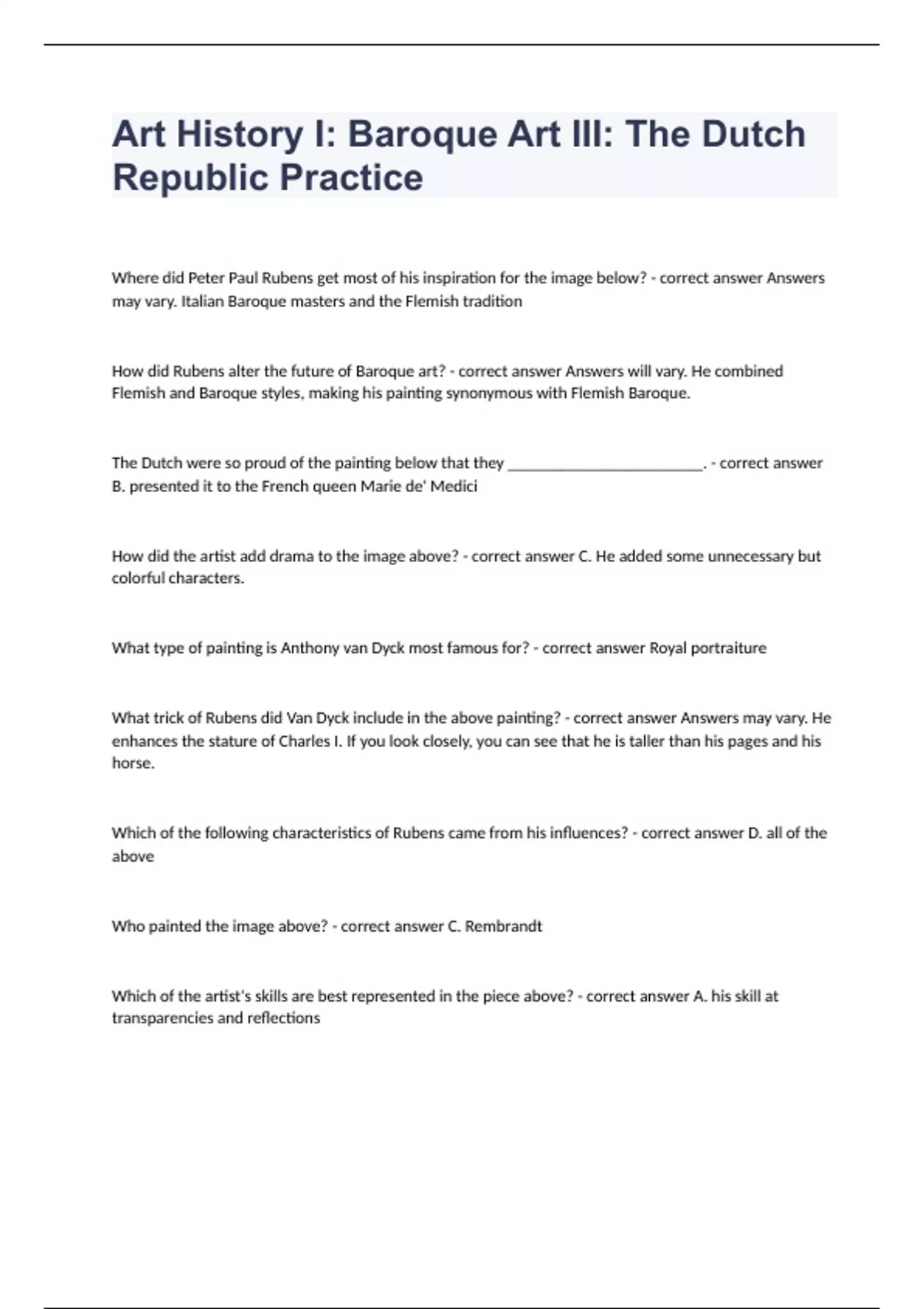 Art History I Baroque Art III The Dutch Republic PracticeWhere did Peter Paul Rubens get most of his inspiration for the image below? - correct answer Answers may vary. Italian Baroque masters and the Flemish tradition How did Rubens alter the future of Baroque art? - correct answer Answers will vary. He combined Flemish and Baroque styles, making his painting synonymous with Flemish Baroque. The Dutch were so proud of the painting below that they _______________________. - correct answer B. presented it to the French queen Marie de' Medici How did the artist add drama to the image above? - correct answer C. He added some unnecessary but colorful characters. What type of painting is Anthony van Dyck most famous for? - correct answer Royal portraiture What trick of Rubens did Van Dyck include in the above painting? - correct answer Answers may vary. He enhances the stature of Charles I. If you look closely, you can see that he is taller than his pages and his horse. Which of the following characteristics of Rubens came from his influences? - correct answer D. all of the above Who painted the image above? - correct answer C. Rembrandt Which of the artist's skills are best represented in the piece above? - correct answer A. his skill at transparencies and reflections