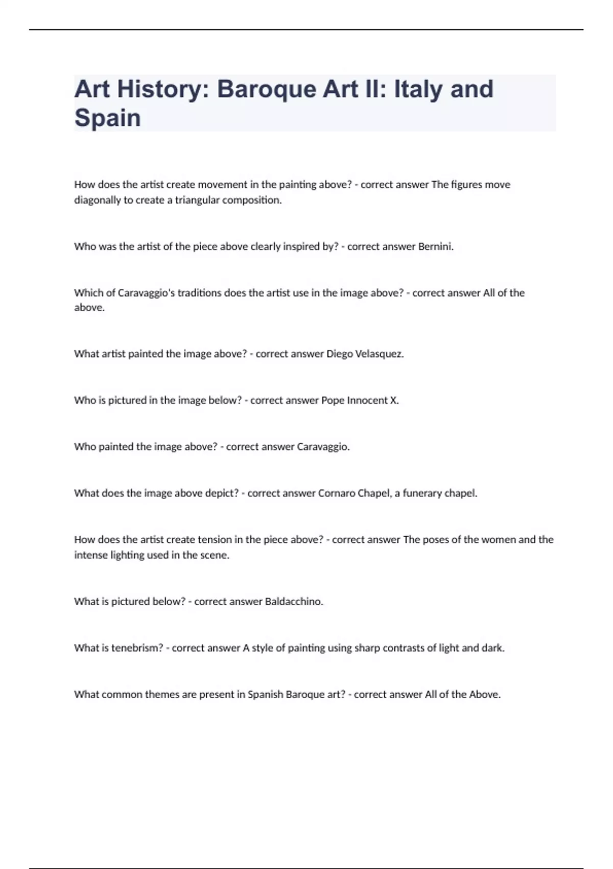 Art History Baroque Art II Italy and SpainHow does the artist create movement in the painting above? - correct answer The figures move diagonally to create a triangular composition. Who was the artist of the piece above clearly inspired by? - correct answer Bernini. Which of Caravaggio's traditions does the artist use in the image above? - correct answer All of the above. What artist painted the image above? - correct answer Diego Velasquez. Who is pictured in the image below? - correct answer Pope Innocent X. Who painted the image above? - correct answer Caravaggio. What does the image above depict? - correct answer Cornaro Chapel, a funerary chapel. How does the artist create tension in the piece above? - correct answer The poses of the women and the intense lighting used in the scene. What is pictured below? - correct answer Baldacchino. What is tenebrism? - correct answer A style of painting using sharp contrasts of light and dark. What common themes are present in Spanish Baroque art? - correct answer All of the Above.