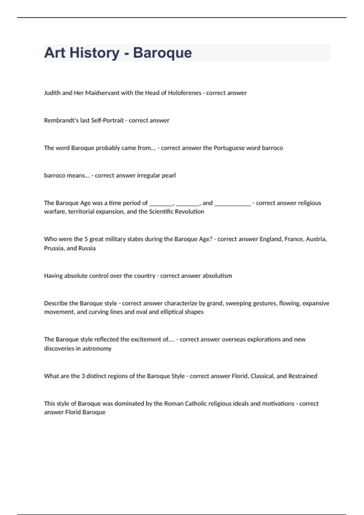 Art History - Baroque Judith and Her Maidservant with the Head of Holoferenes - correct answer Rembrandt's last Self-Portrait - correct answer The word Baroque probably came from... - correct answer the Portuguese word barroco barroco means... - correct answer irregular pearl The Baroque Age was a time period of _______, _______, and ___________ - correct answer religious warfare, territorial expansion, and the Scientific Revolution Who were the 5 great military states during the Baroque Age? - correct answer England, France, Austria, Prussia, and Russia Having absolute control over the country - correct answer absolutism Describe the Baroque style - correct answer characterize by grand, sweeping gestures, flowing, expansive movement, and curving lines and oval and elliptical shapes The Baroque style reflected the excitement of.... - correct answer overseas explorations and new discoveries in astronomy What are the 3 distinct regions of the Baroque Style - correct answer Florid, Classical, and Restrained This style of Baroque was dominated by the Roman Catholic religious ideals and motivations - correct answer Florid Baroque