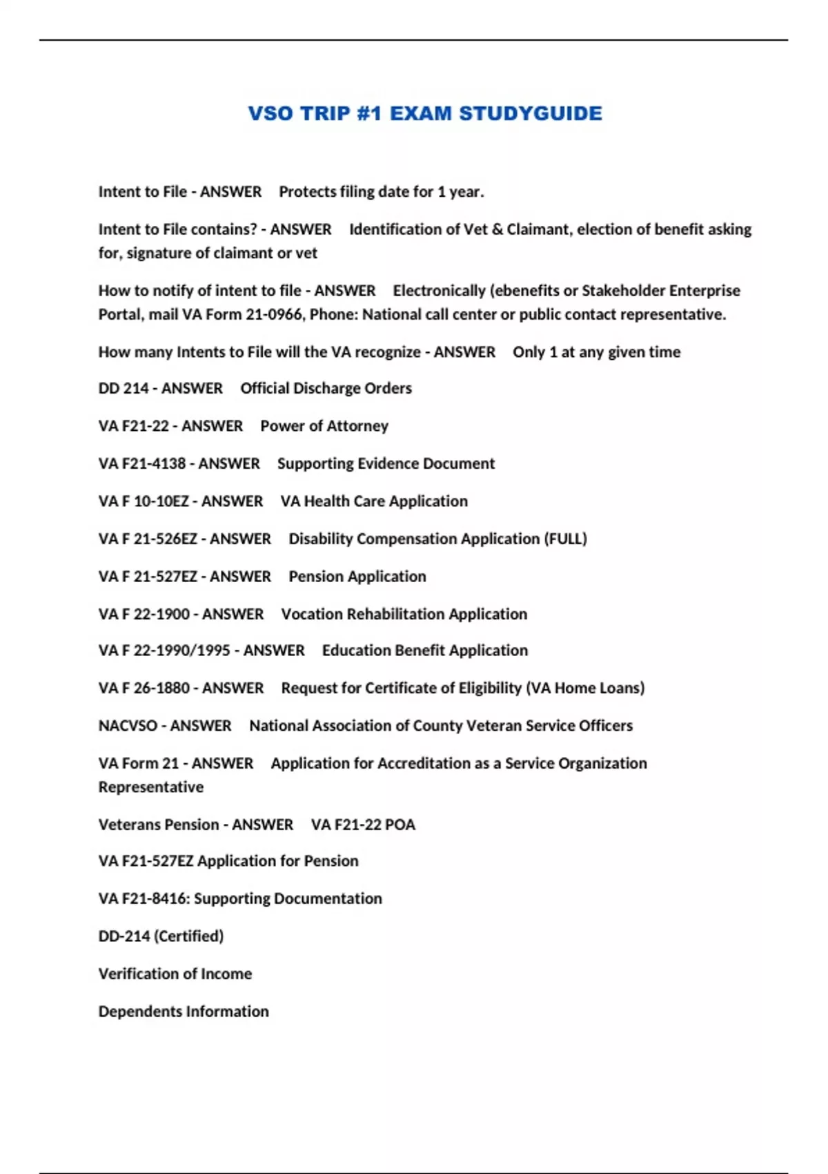 VSO TRIP #1 EXAM STUDYGUIDE