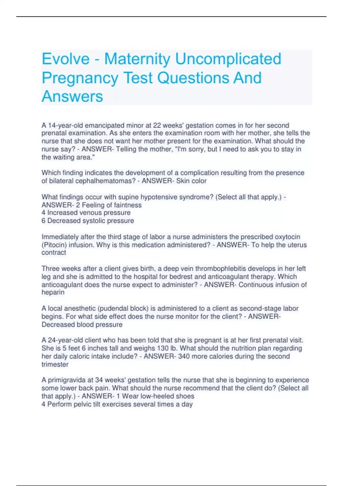 Evolve - Maternity Uncomplicated Pregnancy Test Questions And Answers A 14-year-old emancipated minor at 22 weeks' gestation comes in for her second prenatal examination. As she enters the examination room with her mother, she tells the nurse that she does not want her mother present for the examination. What should the nurse say? - ANSWER- Telling the mother, "I'm sorry, but I need to ask you to stay in the waiting area." Which finding indicates the development of a complication resulting from the presence of bilateral cephalhematomas? - ANSWER- Skin color What findings occur with supine hypotensive syndrome? (Select all that apply.) - ANSWER- 2 Feeling of faintness 4 Increased venous pressure 6 Decreased systolic pressure Immediately after the third stage of labor a nurse administers the prescribed oxytocin (Pitocin) infusion. Why is this medication administered? - ANSWER- To help the uterus contract Three weeks after a client gives birth, a deep vein thrombophlebitis develops in her left leg and she is admitted to the hospital for bedrest and anticoagulant therapy. Which anticoagulant does the nurse expect to administer? - ANSWER- Continuous infusion of heparin A local anesthetic (pudendal block) is administered to a client as second-stage labor begins. For what side effect does the nurse monitor for the client? - ANSWERDecreased blood pressure A 24-year-old client who has been told that she is pregnant is at her first prenatal visit. She is 5 feet 6 inches tall and weighs 130 lb. What should the nutrition plan regarding her daily caloric intake include? - ANSWER- 340 more calories during the second trimester A primigravida at 34 weeks' gestation tells the nurse that she is beginning to experience some lower back pain. What should the nurse recommend that the client do? (Select all that apply.) - ANSWER- 1 Wear low-heeled shoes 4 Perform pelvic tilt exercises several times a day A nurse who is caring for a mother and her newborn infant reviews their record. In light of the data the record contains, what nursing intervention is required? - ANSWERMaternal rubella vaccination The nurse is interpreting the results of a nonstress test (NST) on a client at 41 weeks' gestation. Which result after 20 minutes is suggestive of fetal reactivity? - ANSWERTwo accelerations of 15 beats/min lasting 15 seconds During labor the nurse encourages the client to void periodically. The nurse knows that an over distended urinary bladder during labor can: - ANSWER- Predispose the client to uterine hemorrhage after birth A pregnant woman tells a nurse in the prenatal clinic that she knows that folic acid is very important during pregnancy and that she is taking a prescribed supplement. She asks the nurse what foods contain folic acid (folate) so she may add them to her diet in its natural form. Which foods should the nurse recommend? (Select all that apply.) - ANSWER- 4 Black and pinto beans 5 Enriched bread and pasta What nursing action is the priority for a client in the second stage of labor? - ANSWERPromote effective pushing by the client A nurse is teaching a client to care for her episiotomy after discharge. What priority instruction should the nurse include? - ANSWER- Perform perineal care after toileting until healing occurs. One hour after a birth a nurse palpates a client's fundus to determine whether involution is taking place. The fundus is firm, in the midline, and two fingerbreadths below the umbilicus. What should the nurse do next? - ANSWER- Continue periodic evaluations and record the findings At 5 am, 2 hours after a long labor and vaginal birth, a client is transferred to the postpartum unit. What is the nurse's priority when planning morning care for this client? - ANSWER- Planning nursing care activities that provide time for the client to rest and sleep A nurse is being oriented to a prenatal clinic after graduation. The new nurse takes a course on several tests during pregnancy. Place the tests in the order in which they should be performed during pregnancy. - ANSWER- 1 Sickle cell screening 2 α-Fetoprotein (AFP) testing for neural tube defects 3 Serum glucose for gestational diabetes 4 Fetal movement test 5 Group B Streptococcus culture Which position does the nurse teach the client to avoid when she experiences back pain during labor? - ANSWER- Supine position A postpartum client is being prepared for discharge. The laboratory report indicates that she has a white blood cell (WBC) count of 16,000/dL. What is the next nursing action? - ANSWER- Placing the report in the client's record because this is an expected postpartum finding A nurse assesses a new mother who is breastfeeding. The client asks how to care for her nipples. What should the nurse recommend? - ANSWER- Spreading breast milk on the nipples after the feeding and allowing them to air dry A client is receiving an oxytocin (Pitocin) infusion for induction of labor. The uterine graph on the electronic monitor indicates no rest period between contractions, and this is confirmed on palpation. What should the nurse do first? - ANSWER- Turn the oxytocin infusion off A contraction stress test (CST) is performed on a client at 40 weeks' gestation. The findings are interpreted as negative. What does the nurse conclude from this interpretation? - ANSWER- There will be weekly retesting because, at this time, the fetus has oxygen reserves. What are the indicators of nutritional risk in pregnancy in a client who is of normal weight? (Select all that apply.) - ANSWER- 1 Smoker 2 Twin gestation During a prenatal visit a client who is at 36 weeks' gestation states that she is having uncomfortable irregular contractions. How should the nurse respond? - ANSWER- "Walk around until they subside." A woman's pregnancy has been uneventful, and she has gained 25 lb. At term her hemoglobin level is 10.6 g/dL and her hematocrit is 31%. What does the nurse identify as the reason for these hemoglobin and hematocrit levels? - ANSWER- Hemodilution Duri