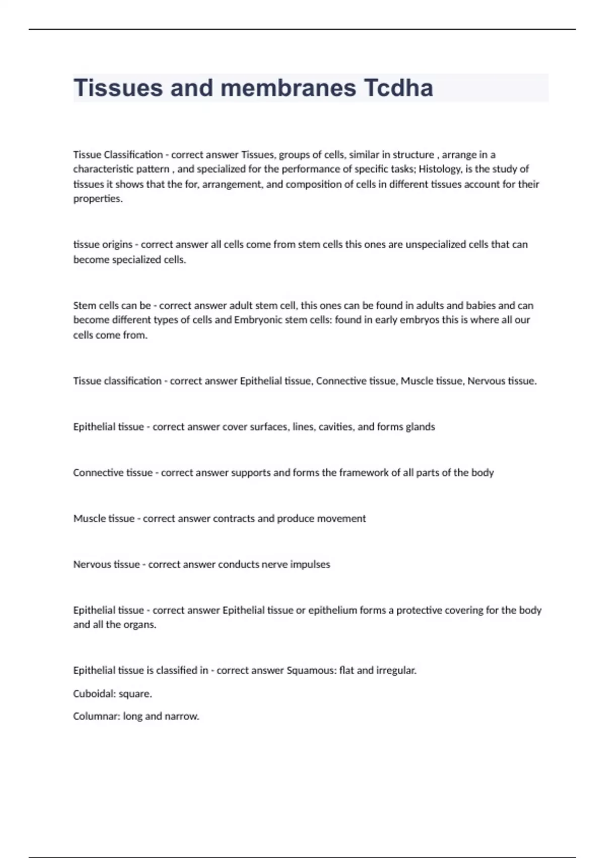 Tissues and membranes Tissue Classification - correct answer Tissues, groups of cells, similar in structure , arrange in a characteristic pattern , and specialized for the performance of specific tasks; Histology, is the study of tissues it shows that the for, arrangement, and composition of cells in different tissues account for their properties. tissue origins - correct answer all cells come from stem cells this ones are unspecialized cells that can become specialized cells. Stem cells can be - correct answer adult stem cell, this ones can be found in adults and babies and can become different types of cells and Embryonic stem cells: found in early embryos this is where all our cells come from. Tissue classification - correct answer Epithelial tissue, Connective tissue, Muscle tissue, Nervous tissue. Epithelial tissue - correct answer cover surfaces, lines, cavities, and forms glands Connective tissue - correct answer supports and forms the framework of all parts of the body Muscle tissue - correct answer contracts and produce movement Nervous tissue - correct answer conducts nerve impulses Epithelial tissue - correct answer Epithelial tissue or epithelium forms a protective covering for the body and all the organs. Epithelial tissue is classified in - correct answer Squamous: flat and irregular. Cuboidal: square. Columnar: long and narrow.