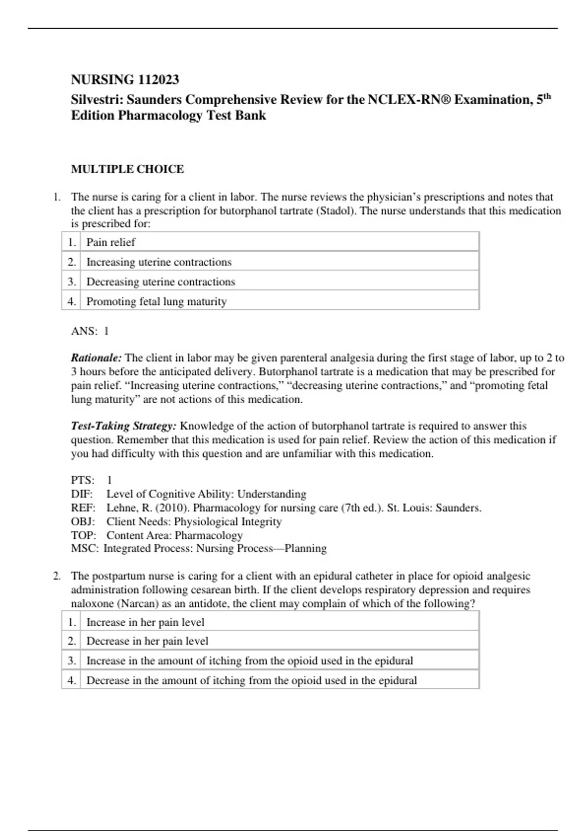 NURSING 112023 Silvestri: Saunders Comprehensive Review for the NCLEX-RN® Examination, 5th Edition Pharmacology Test Bank MULTIPLE CHOICE 1. The nurse is caring for a client in labor. The nurse reviews the physician’s prescriptions and notes that the client has a prescription for butorphanol tartrate (Stadol). The nurse understands that this medication is prescribed for: 1. Pain relief 2. Increasing uterine contractions 3. Decreasing uterine contractions 4. Promoting fetal lung maturity ANS: 1 Rationale: The client in labor may be given parenteral analgesia during the first stage of labor, up to 2 to 3 hours before the anticipated delivery. Butorphanol tartrate is a medication that may be prescribed for pain relief. “Increasing uterine contractions,” “decreasing uterine contractions,” and “promoting fetal lung maturity” are not actions of this medication.