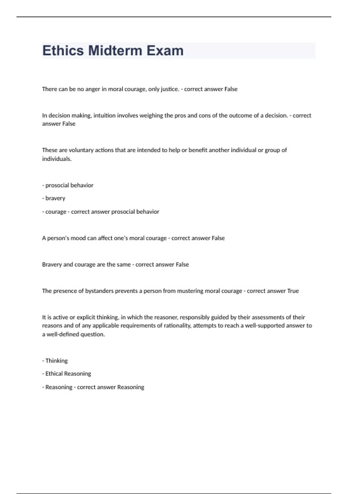 There can be no anger in moral courage, only justice. - correct answer False In decision making, intuition involves weighing the pros and cons of the outcome of a decision. - correct answer False These are voluntary actions that are intended to help or benefit another individual or group of individuals. - prosocial behavior - bravery - courage - correct answer prosocial behavior A person's mood can affect one's moral courage - correct answer False Bravery and courage are the same - correct answer False The presence of bystanders prevents a person from mustering moral courage - correct answer True It is active or explicit thinking, in which the reasoner, responsibly guided by their assessments of their reasons and of any applicable requirements of rationality, attempts to reach a well-supported answer to a well-defined question. - Thinking - Ethical Reasoning - Reasoning - correct answer Reasoning It is the ability to reflect on moral issues in the abstract and in historical narratives within particular traditions. - Thinking - Ethical Reasoning - Reasoning - correct answer Ethical Reasoning It is a form of virtue ethics that talks about a variety of human traits that men find admirable such as: benevolence, compassion, and kindness. - ethics of care - Agent-based account - eudaimonia - correct answer Agent-based account According to Lawrence Kohlberg, this level of moral development is seen in children when they do things for punishment avoidance, and for exchange of favors. - Conventional morality - post-conventional morality - Pre-conventional morality - correct answer Pre-conventional morality One day, Batista was walking along Recto avenue when he saw a child being bullied by adults into giving his allowance to them. Batista intervened and fought the the adults to save the child from being robbed of his allowance, he got injured though in the process What prosocial behavior was exhibited? - Moral Courage - Heroism - social control - correct answer Moral Courage There are 3 stages of moral development according to Lawrence Kohlberg -- Pre-conventional morality, Conventional morality, Post-conventional morality. - correct answer False The role of ethics is to remove emotions in the decision making process - correct answer False Moral courage is entirely the same as helping behavior - correct answer False Badong was trapped and unconscious inside their burning house, Badang, his brother get into the house without hesitation and saved him from death. What prosocial behavior was exhibited? - Helping - heroism - moral courage - correct answer heroism This is an Aristotelian term loosely translated as happiness.